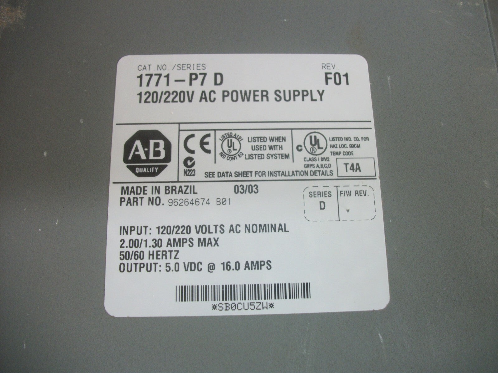 ALLEN-BRADLEY 120/220VOLT AC PLC POWER SUPPLY 1771-P7D