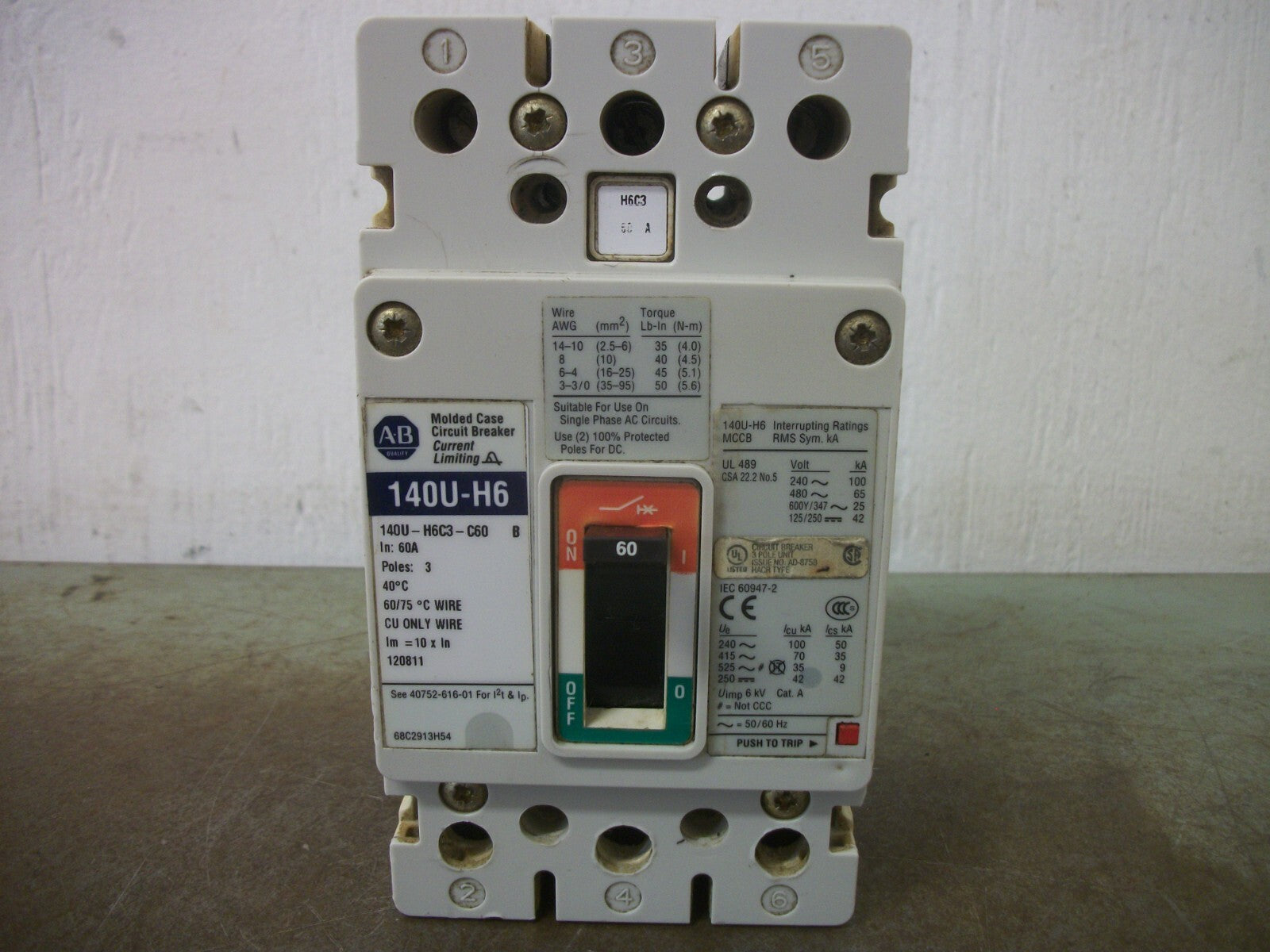 ALLEN-BRADLEY 140U-H6 CIRCUIT BREAKER 140U-H6C3-C60 60AMP 600VOLT 3POLE