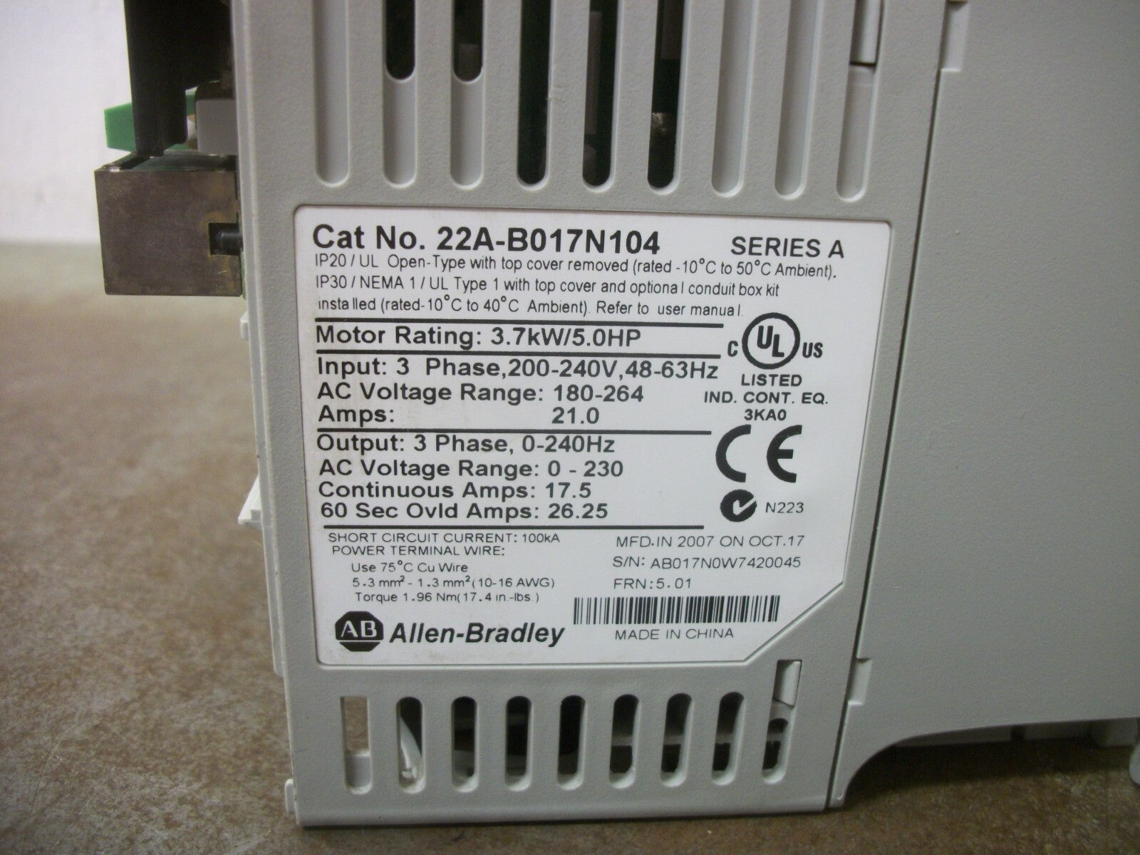 ALLEN-BRADLEY POWERFLEX 4 5HP AC DRIVE 22A-B017N104 230VOLT 3PH 17.5AMP NO COVER