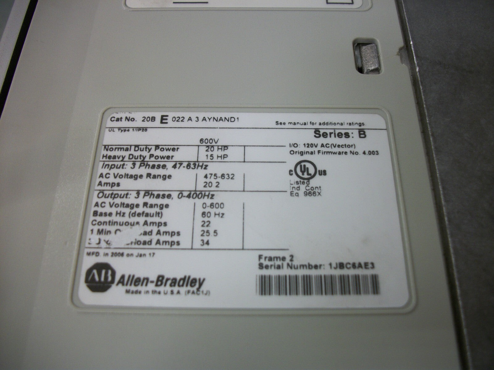 ALLEN-BRADLEY POWERFLEX 700 20HP AC DRIVE 20BE022A3AYNAND1 600VOLT 3PH 22AMP