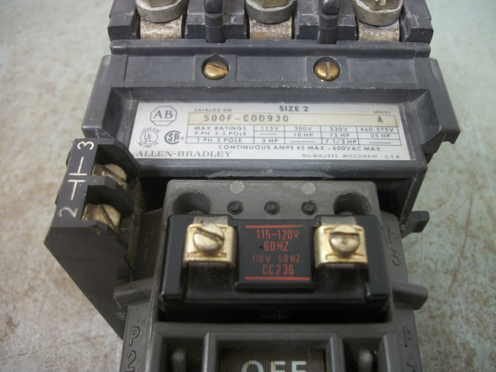 ALLEN-BRADLEY SIZE 2 CONTACTOR 500F-COD930 45AMP 120VCOIL 3PH 600V 25HP