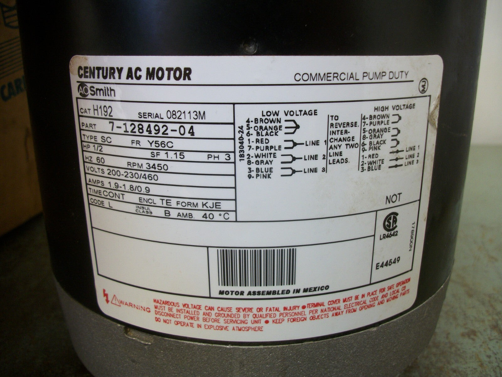 AO SMITH CENTURY 1/2HP TENV Y56C AC MOTOR H192 460VOLT 3450RPM 3PH NIB
