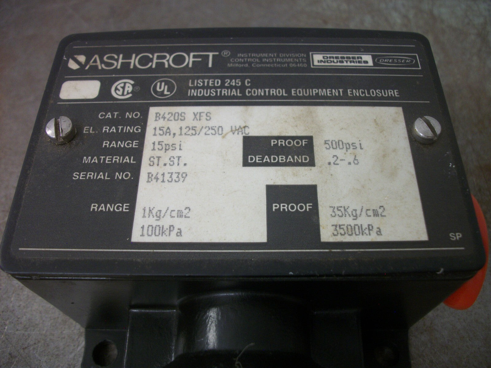 ASHCROFT PRESSURE SWITCH B420S XFS 15AMP 125/250VAC 15-500PSI NOB