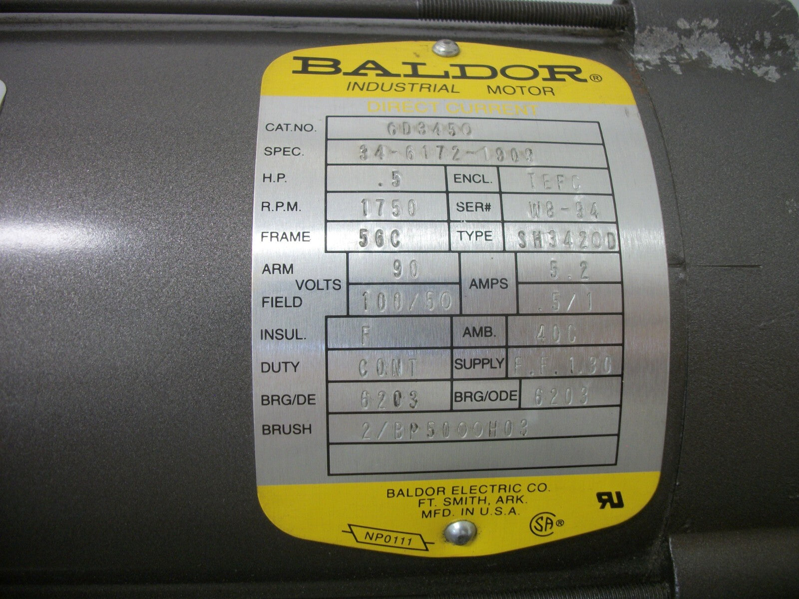 BALDOR .5HP 56C TEFC DC MOTOR CD3450 90V ARM 100/50V FIELD 1750RPM NOB