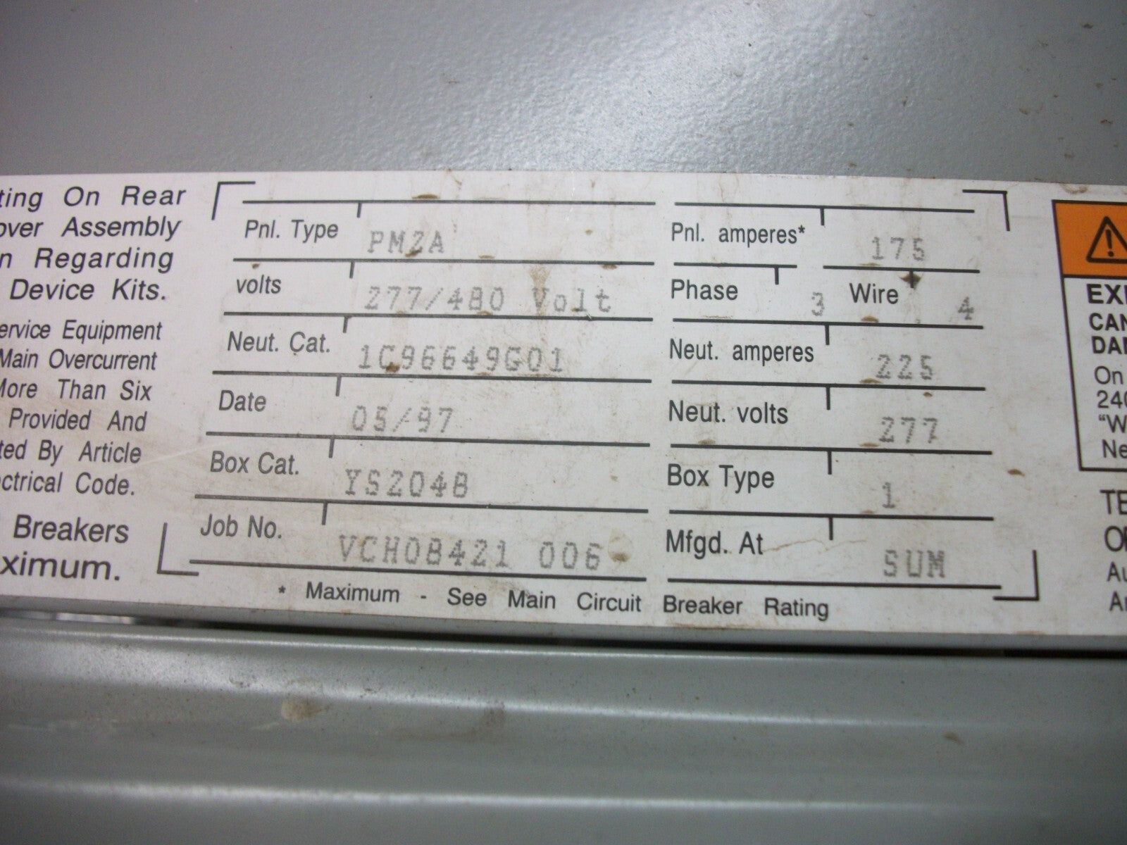 CHALLENGER PMZA LOAD CENTER PANELBOARD YS204B 175AMP 277/480VOLT 3PH W/150A MAIN