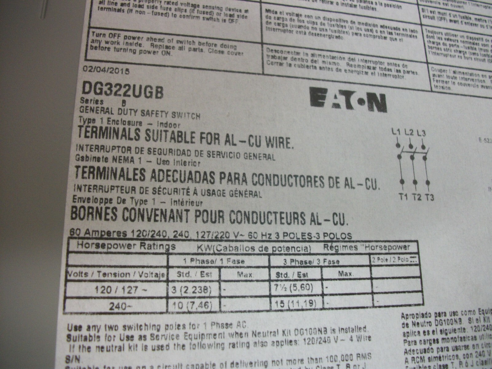 CUTLER-HAMMER DISCONNECT TYPE 1 DG322UGB 60AMP 240VOLT NON-FUSIBLE NOB