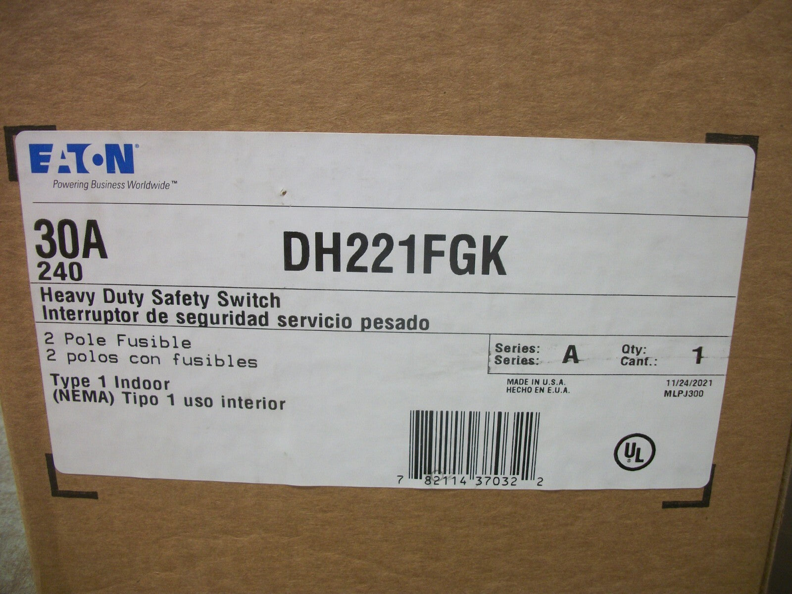 CUTLER-HAMMER DISCONNECT TYPE 1 DH221FGK 30AMP 240VOLT 2POLE FUSIBLE NIB