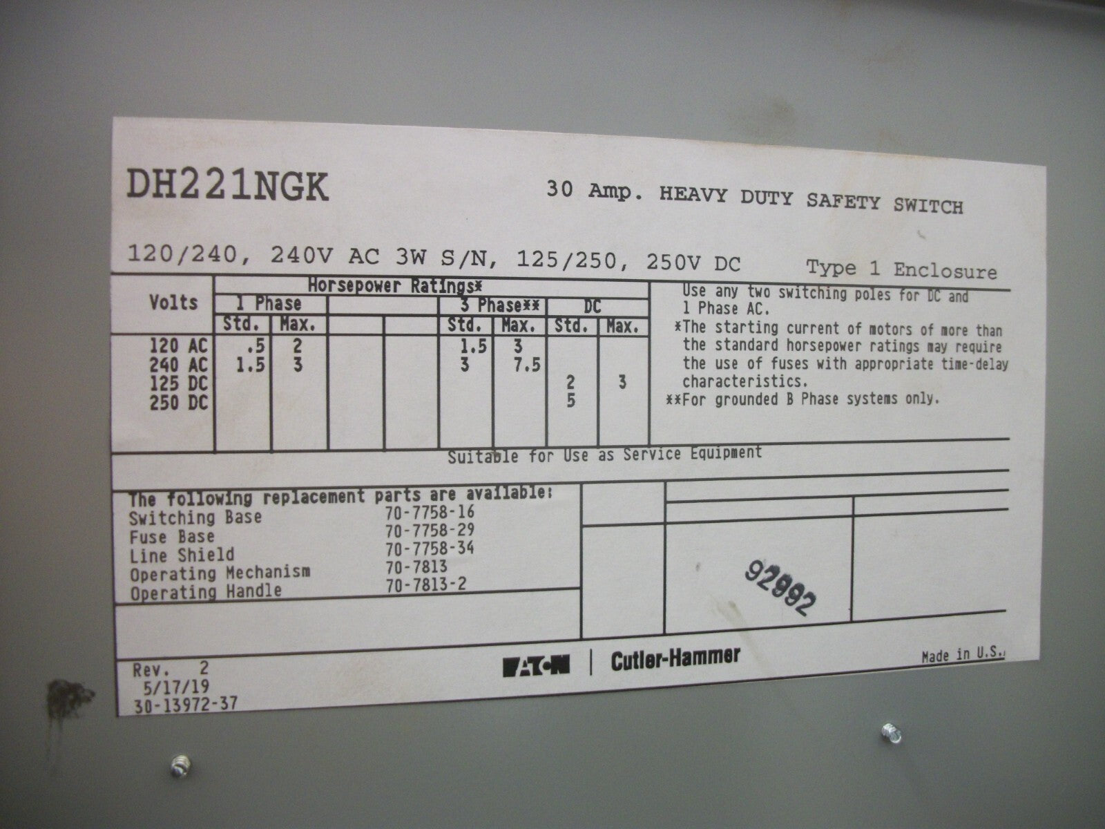 CUTLER-HAMMER DISCONNECT TYPE 1 DH221NGK 30AMP 240VOLT 2POLE FUSIBLE