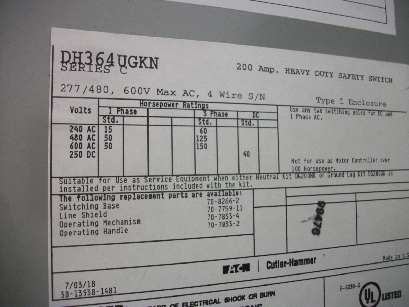 CUTLER-HAMMER DISCONNECT TYPE 1 DH364UGKN 200AMP 600VOLT 3POLE NON-FUSIBLE NOB