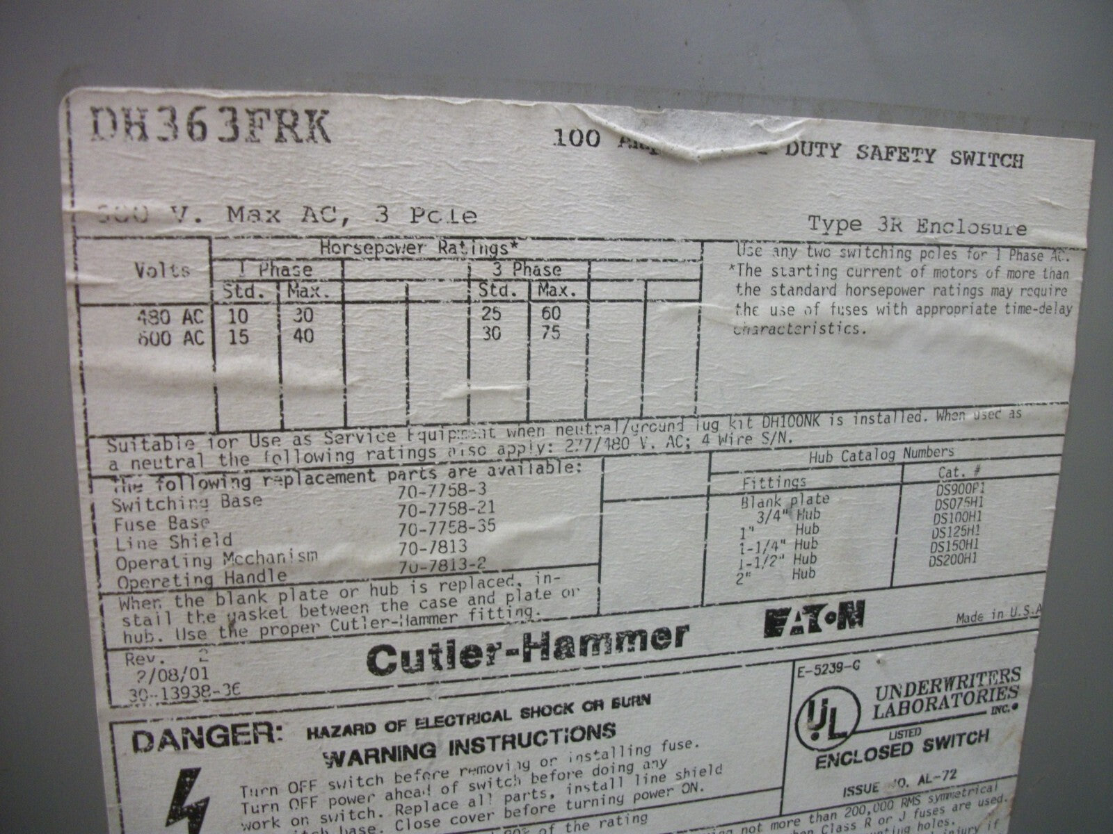 CUTLER-HAMMER DISCONNECT TYPE 3R DH363FRK 100AMP 600VOLT 3POLE FUSIBLE REFURB