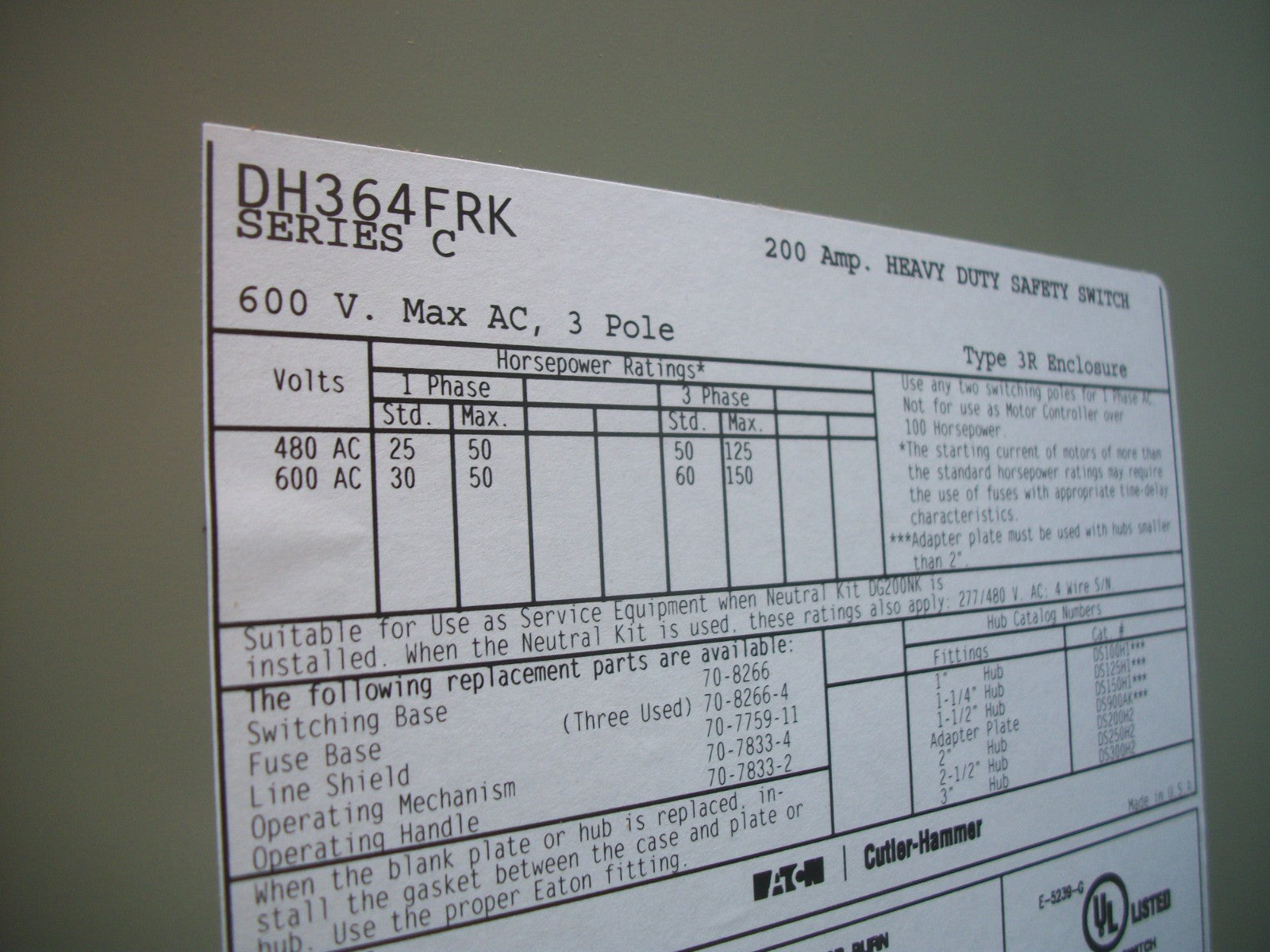 CUTLER-HAMMER DISCONNECT TYPE 3R DH364FRK 200AMP 600VOLT 3POLE FUSIBLE NIB