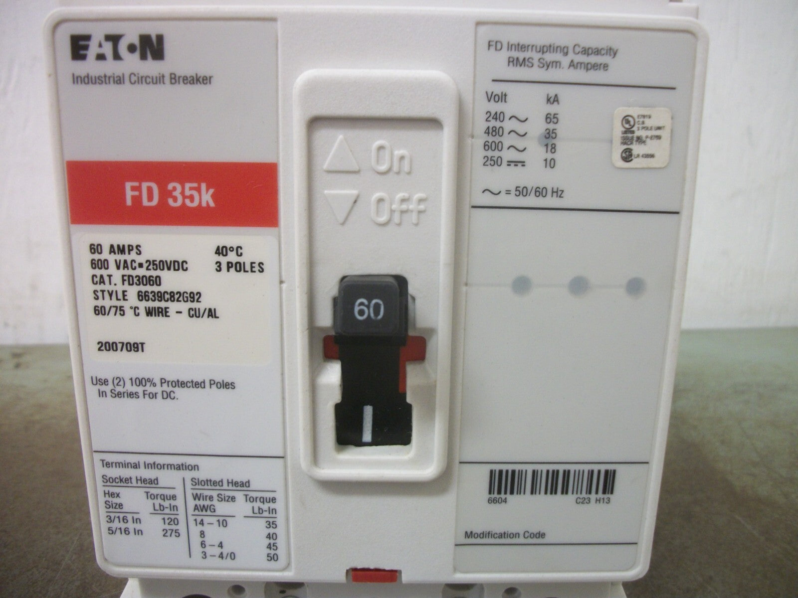 CUTLER-HAMMER FD CIRCUIT BREAKER FD3060 60AMP 600VOLT 3POLE RED