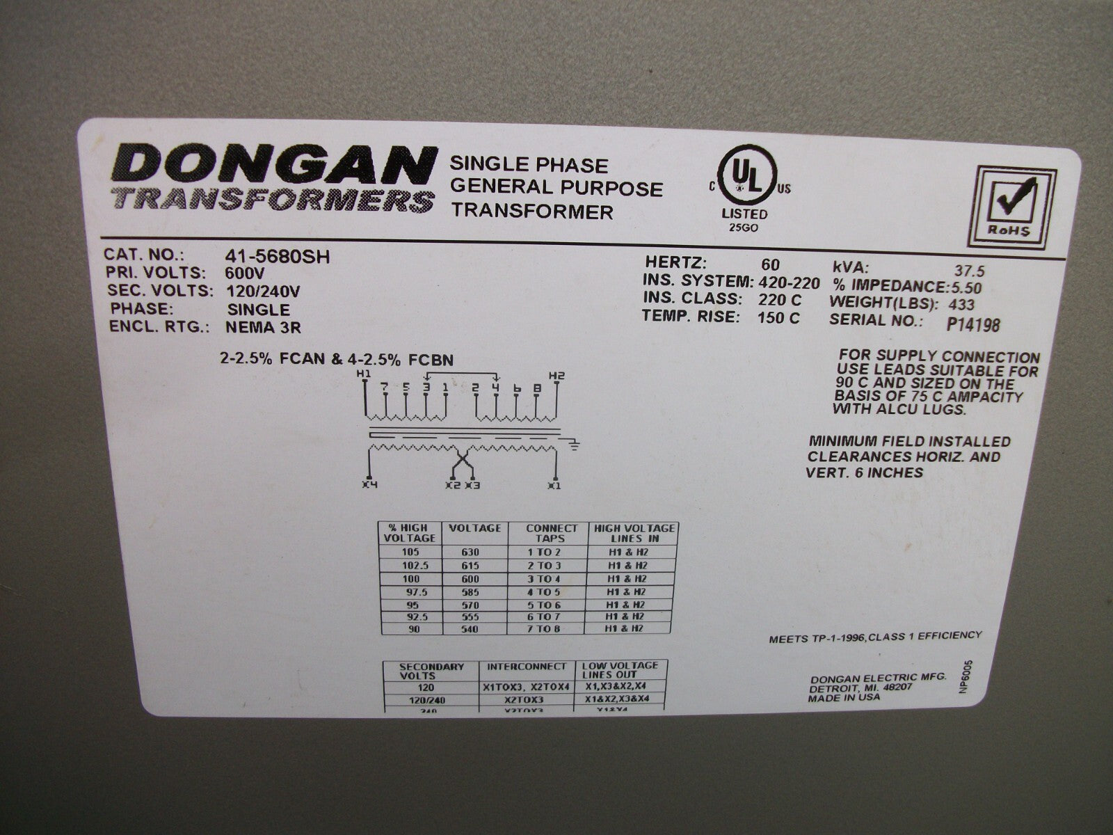 DONGAN 37.5KVA 1PH 3R TRANSFORMER 41-5680SH HV 600 LV 120/240