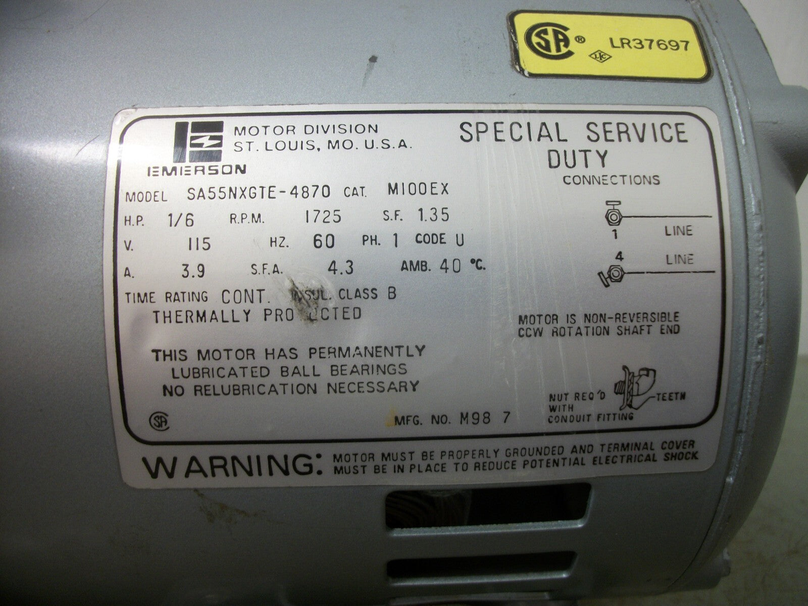EMERSON SA55NXGTE-4870 1/6HP 1PH VACUUM PUMP MOTOR M100EX 115VOLT 1725RPM