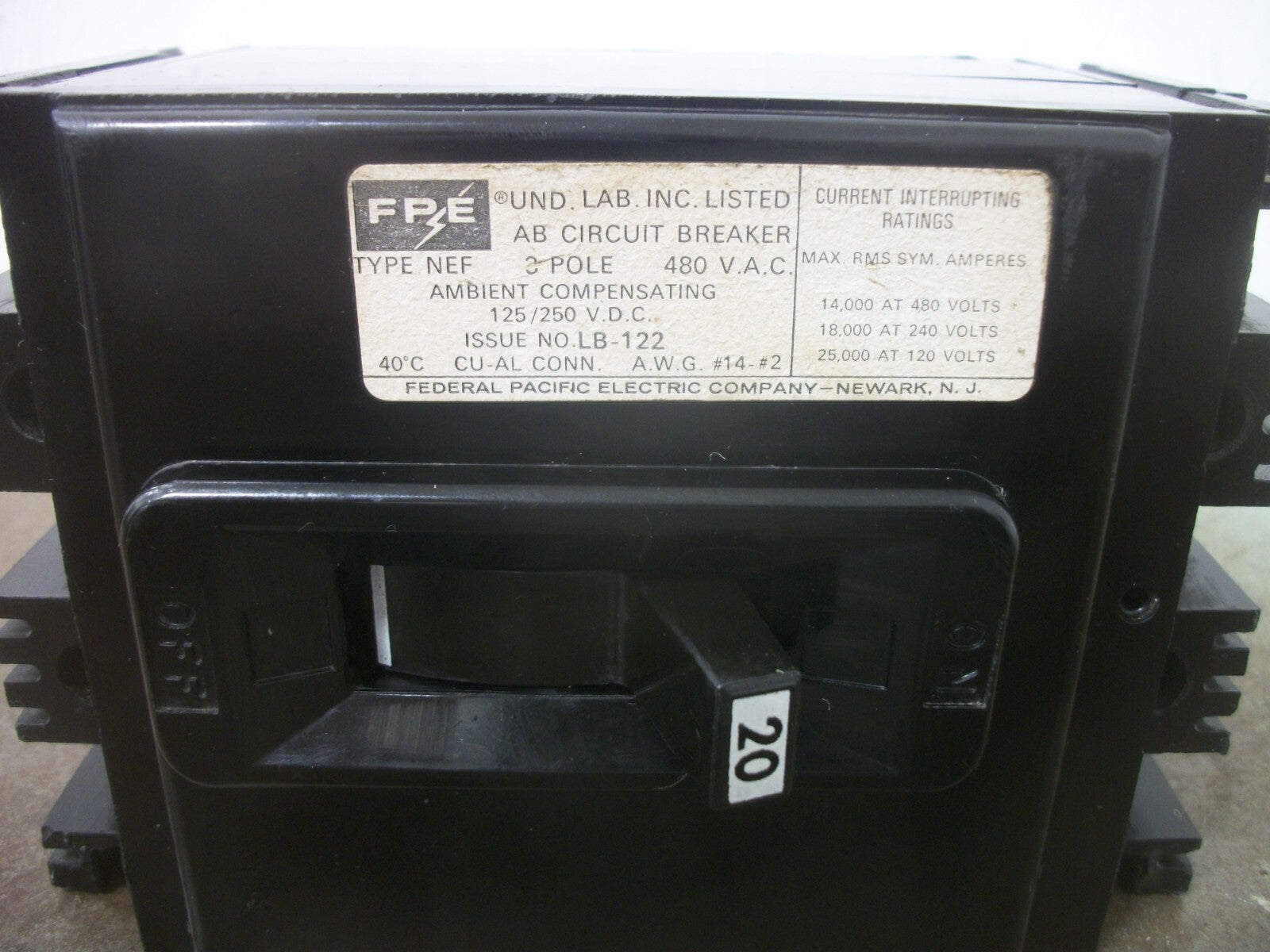 FEDERAL PACIFIC NEF CIRCUIT BREAKER NEF431020 20AMP 480VOLT 3POLE