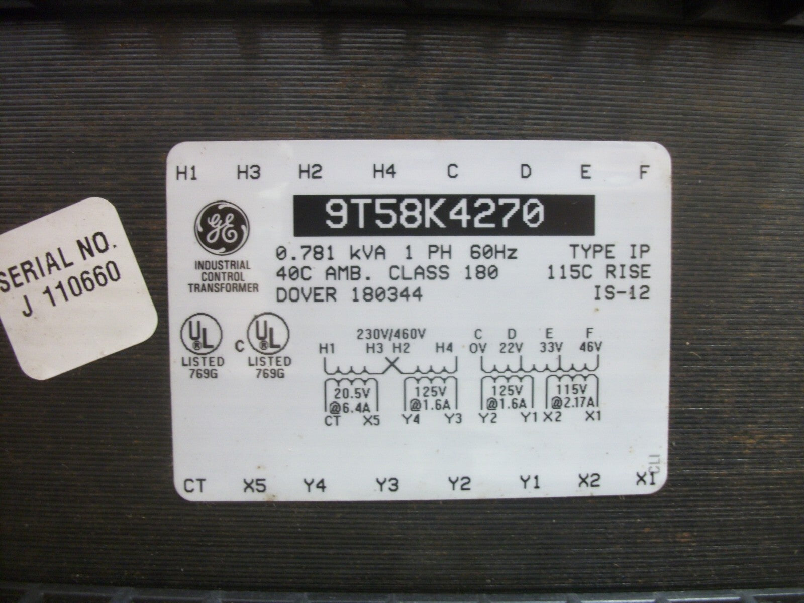 GE .781KVA 1PH TRANSFORMER 9T58K4270 HV 0X46 230X460 LV 20.5/125 115/125 NIB