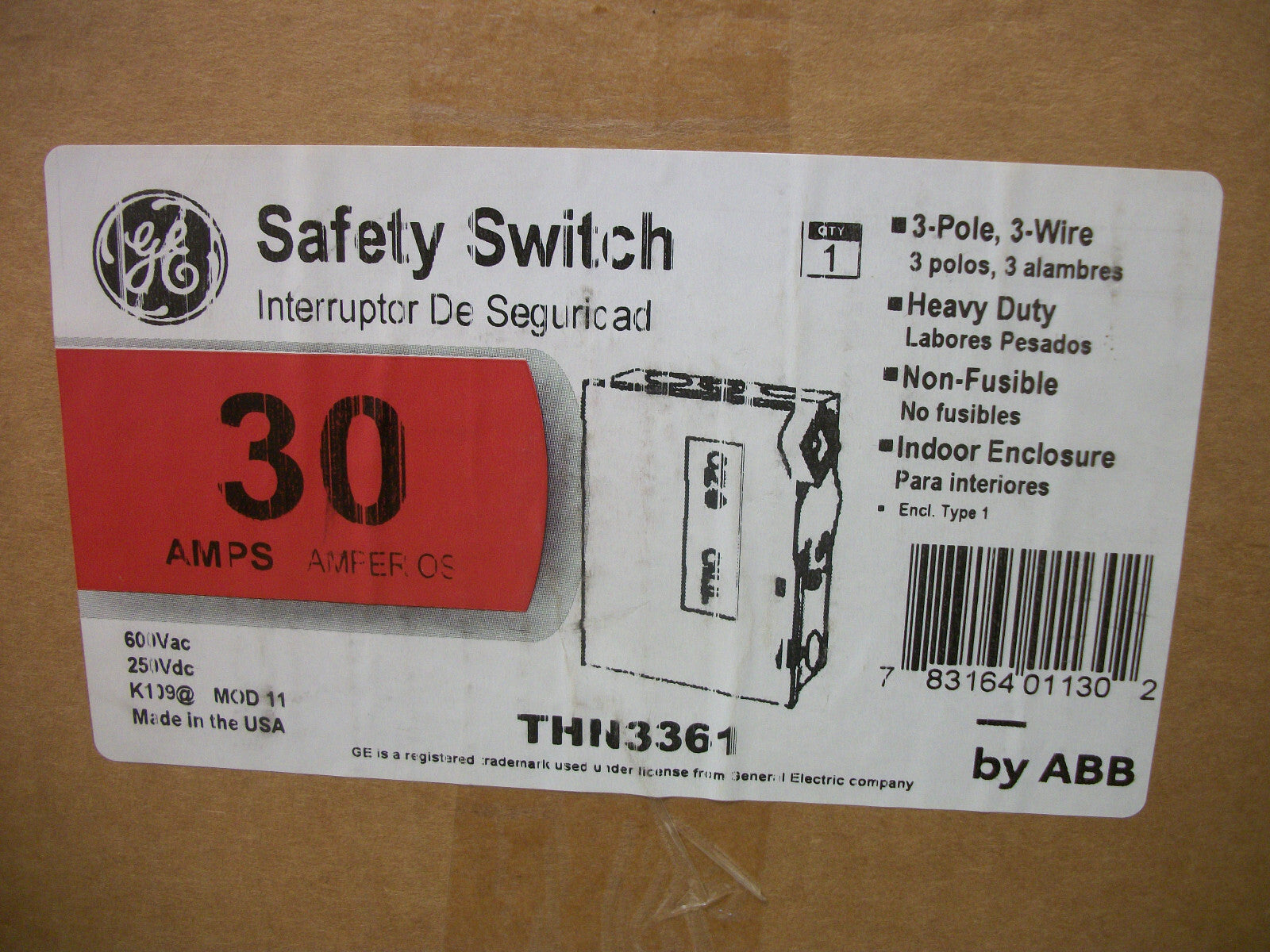 GE DISCONNECT TYPE 1 THN3361 30AMP 600VOLT 3POLE NON-FUSIBLE NIB