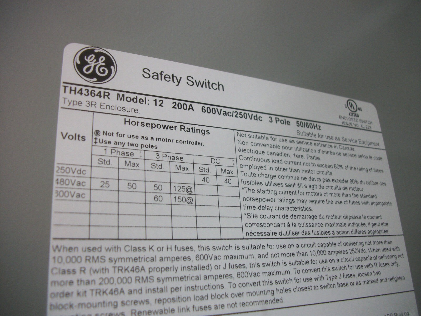 GE DISCONNECT TYPE 3R TH4364R 200AMP 600VOLT 3POLE FUSIBLE NIB