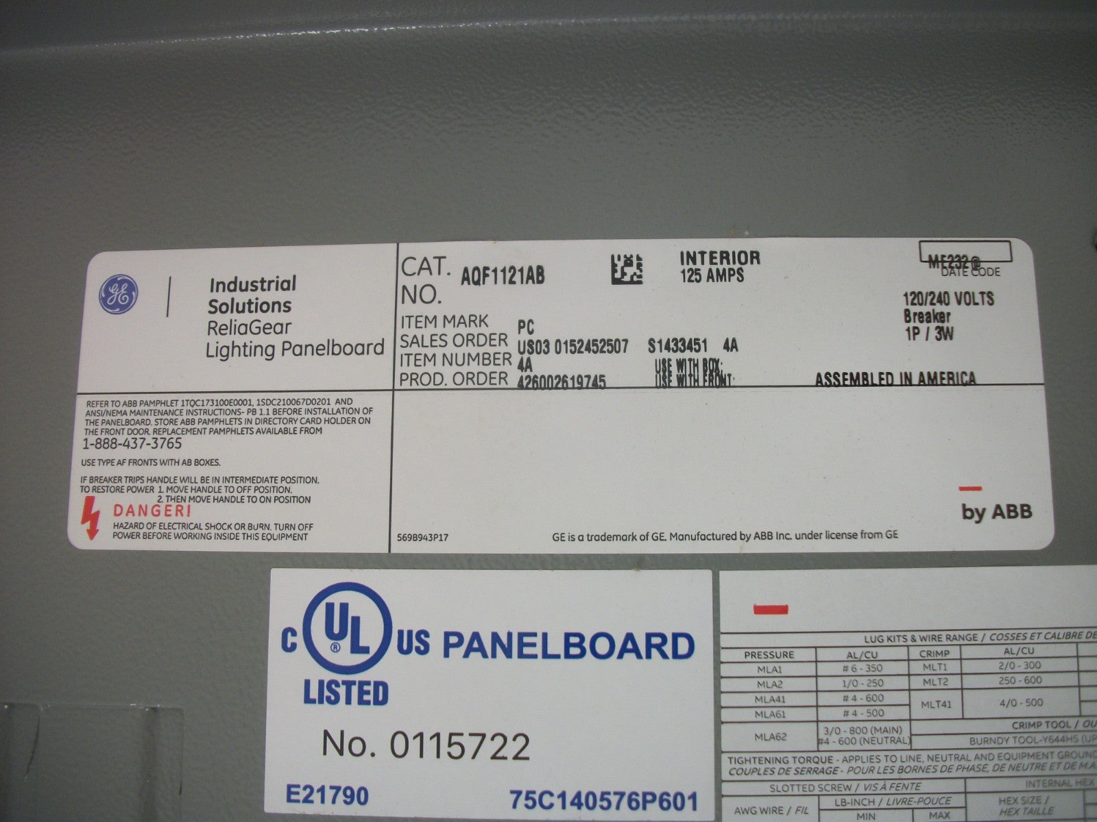GE RELIAGEAR LIGHTING PANELBOARD INTERIOR AQF1121AB 125A 120/240V 1PH 40A MAIN