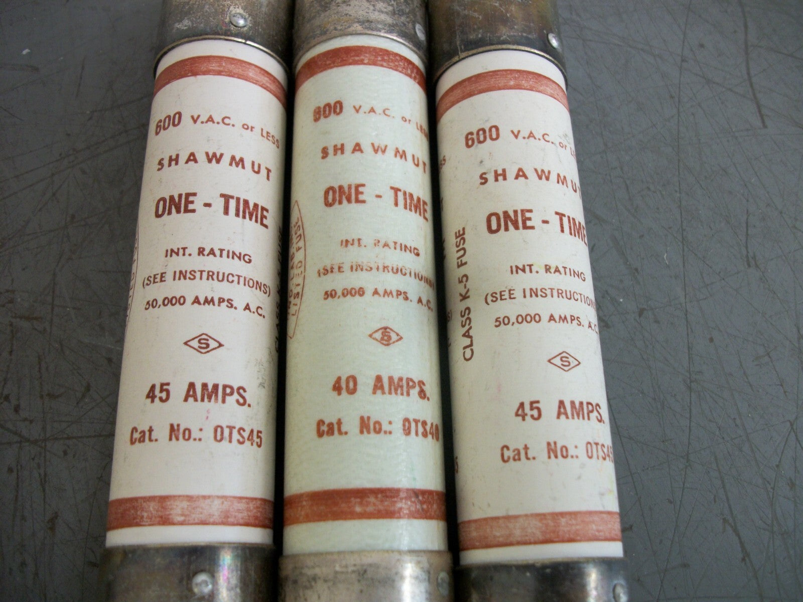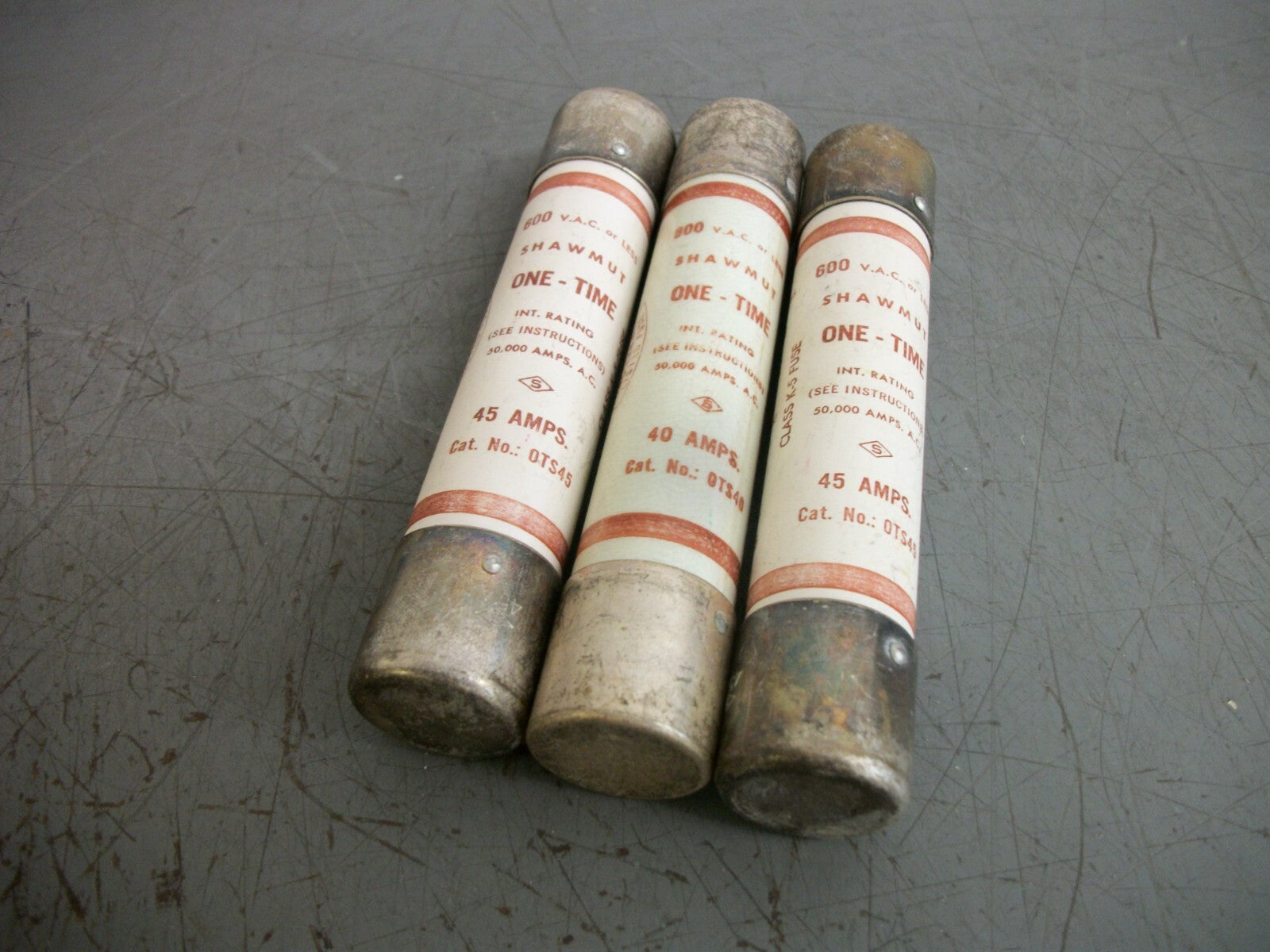 GOULD SHAWMUT LOT OF 3 ONE-TIME FUSES OTS45 OTS40 45AMP 40AMP 600VOLT NOB
