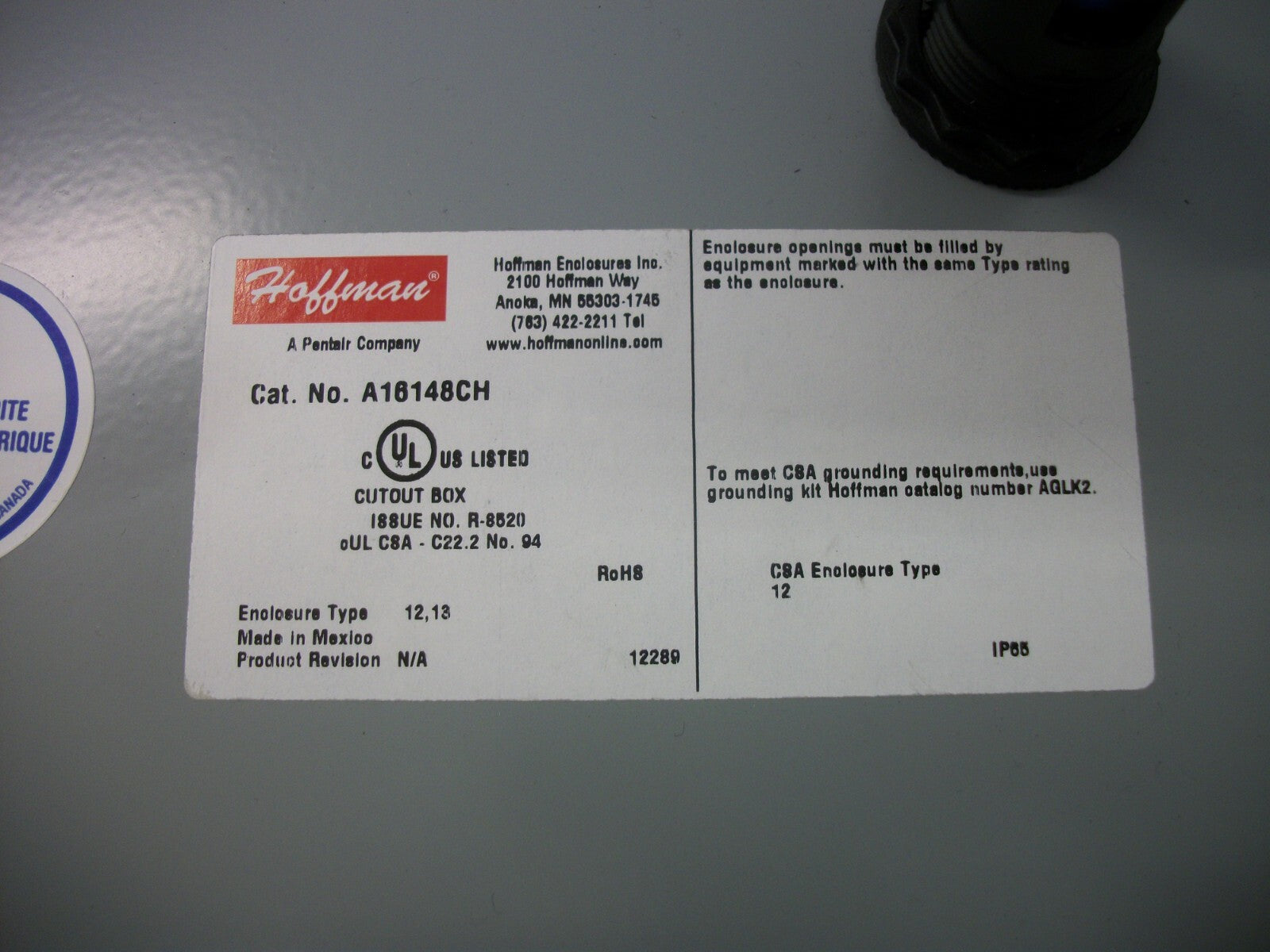 HOFFMAN 16 X 14 X 8 ENCLOSURE TYPE 12,13 A16148CH