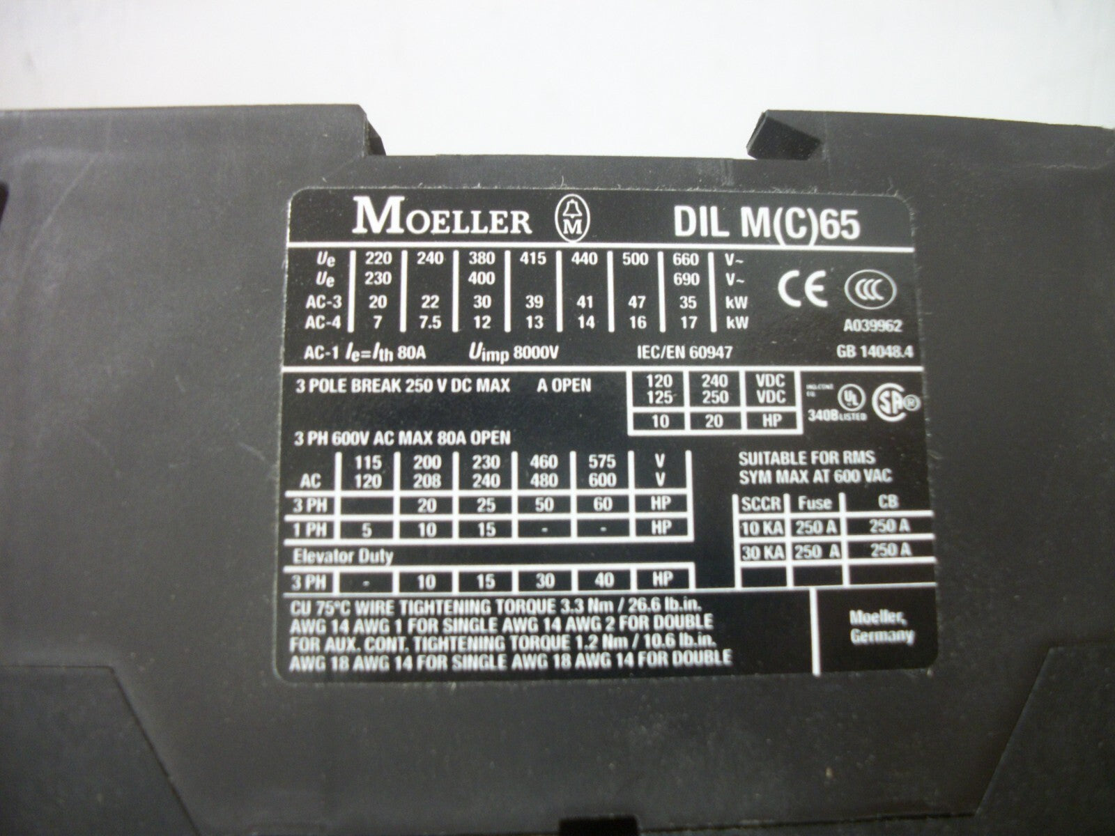 KLOCKNER-MOELLER XSTART CONTACTOR DILM65 80AMP 120VCOIL 3PH 600V 60HP NIB