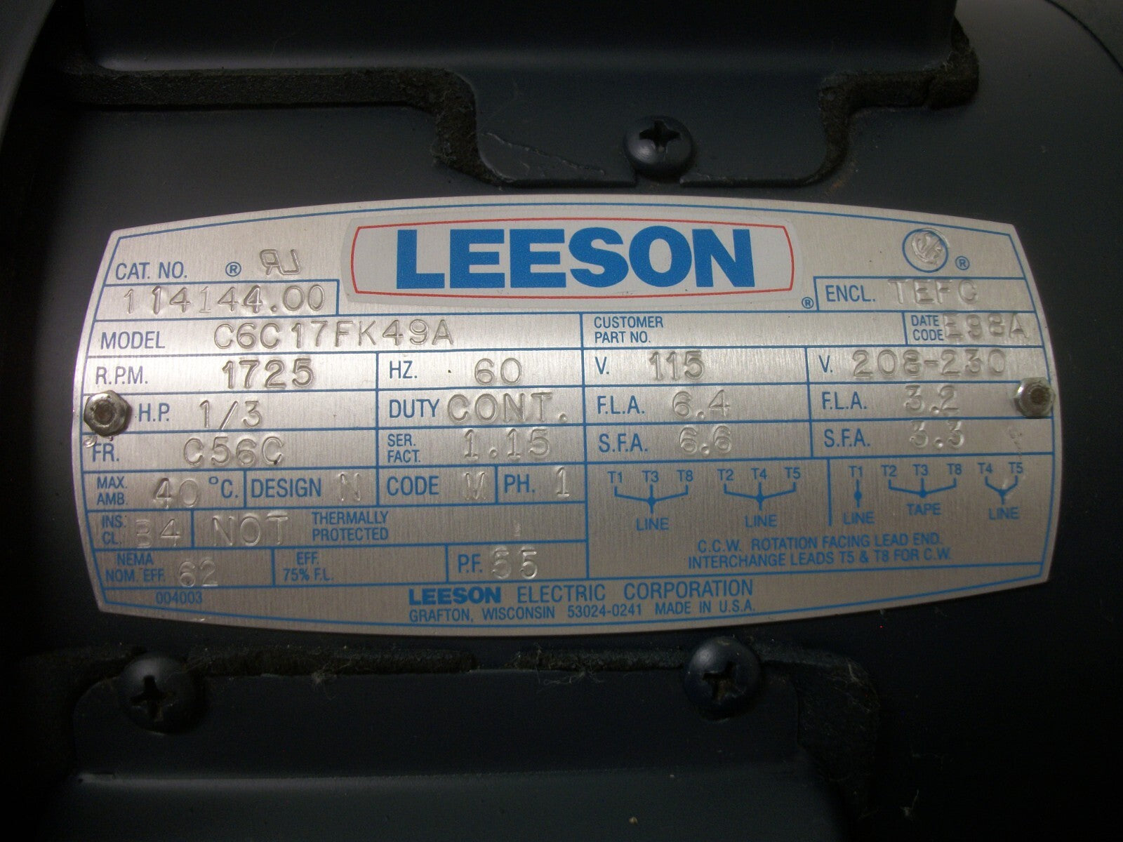 LEESON 1/3HP C56C TEFC AC MOTOR 114144.00 230VOLT 1PH 1725RPM NOB