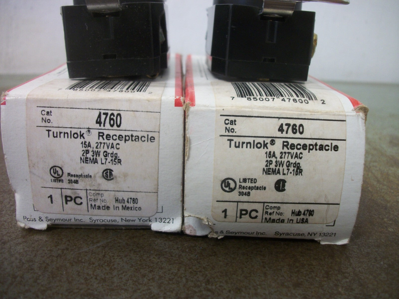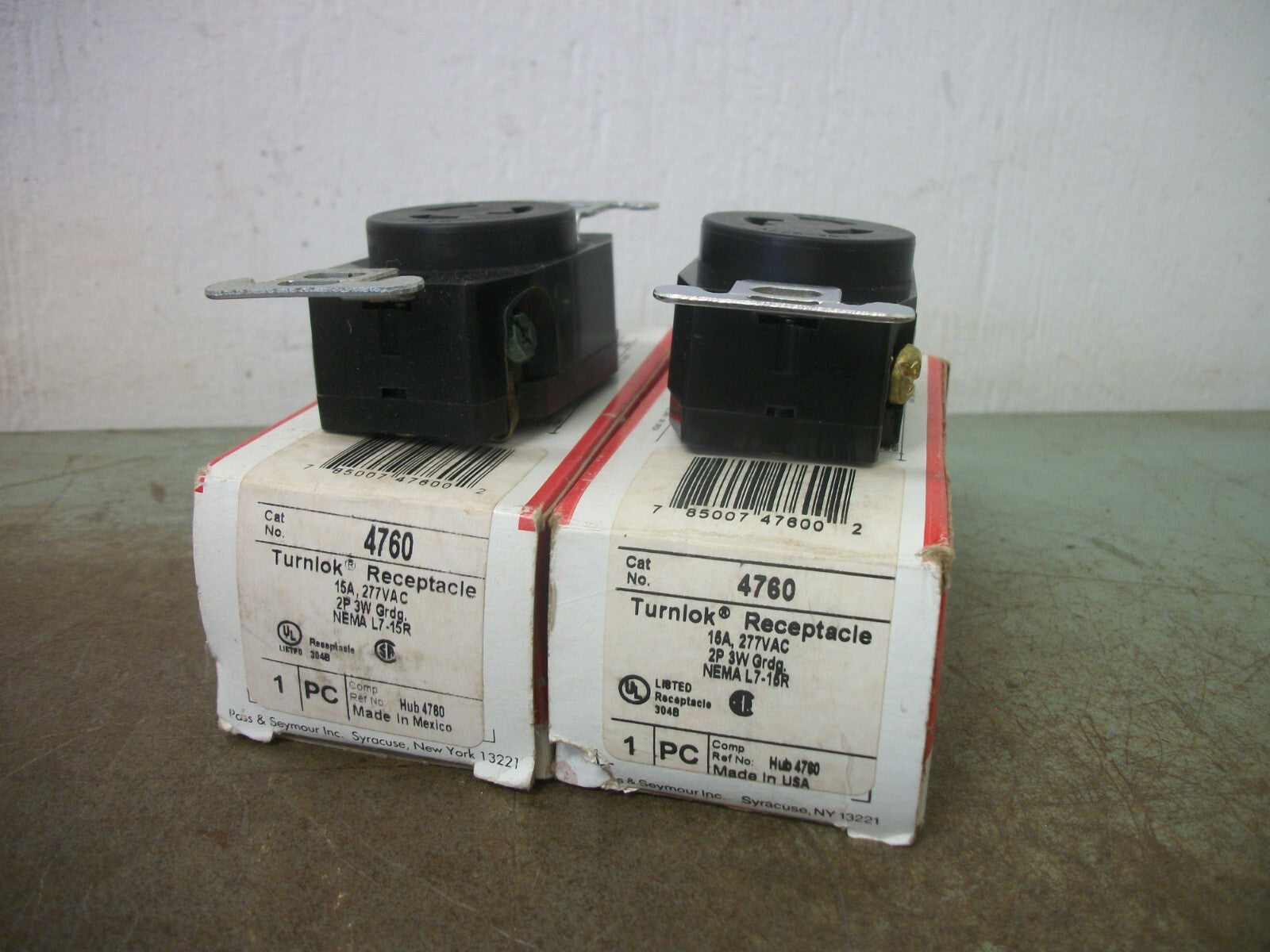 PASS & SEYMOUR LOT OF 2 TURNLOK RECEPTACLES 4760 15AMP 277VOLT 2P 3W GRND NIB