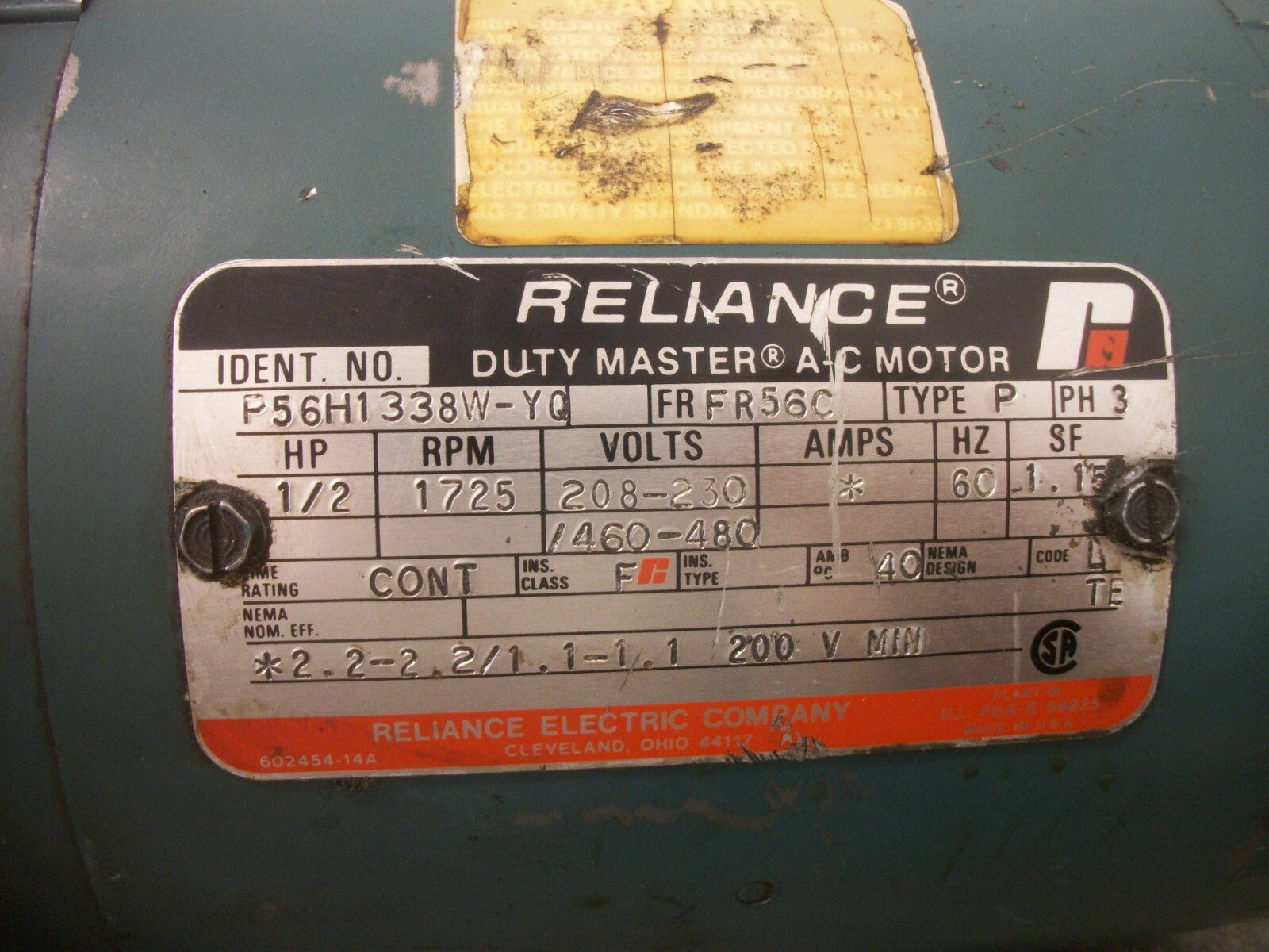 RELIANCE 1/2HP FR56C TE AC MOTOR P56H1338W-YQ 480VOLT 3PH 1725RPM