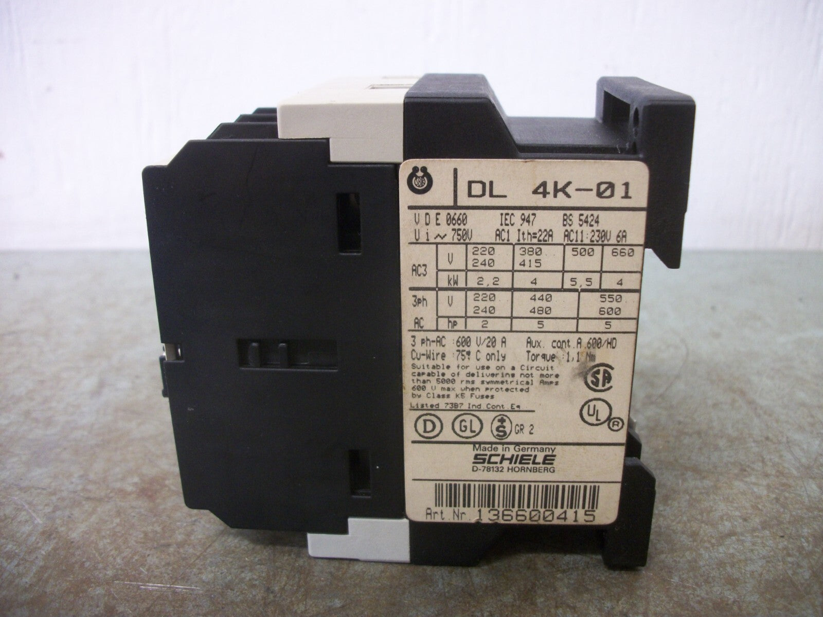SCHIELE CONTACTOR DL4K-01 20AMP 48VCOIL 3PH 600V 5HP NOB