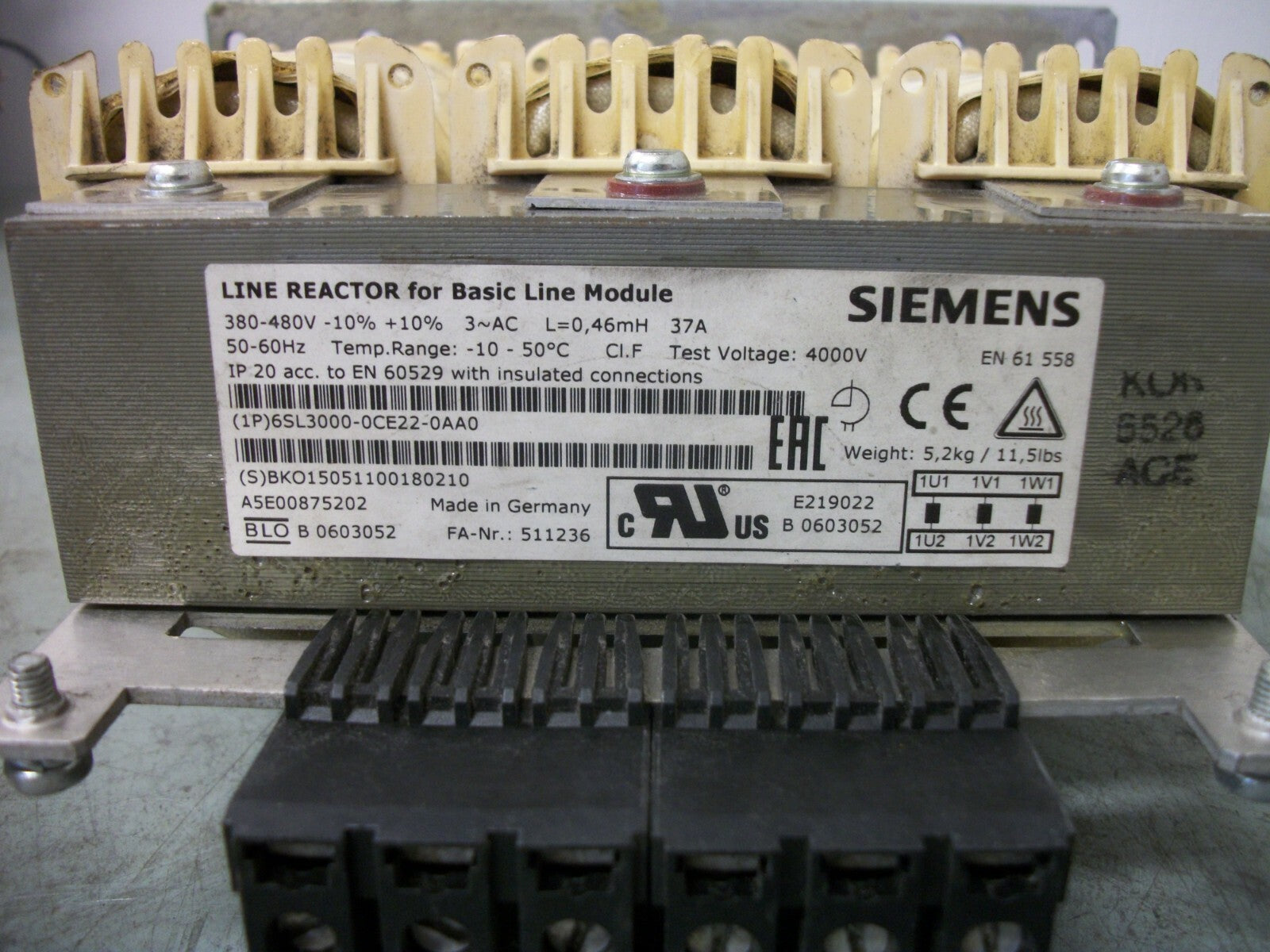 SIEMENS 3PH LINE REACTOR 1P 6SL3000-0CE22-0AA0 380-480VOLT 37AMP 0.46mH