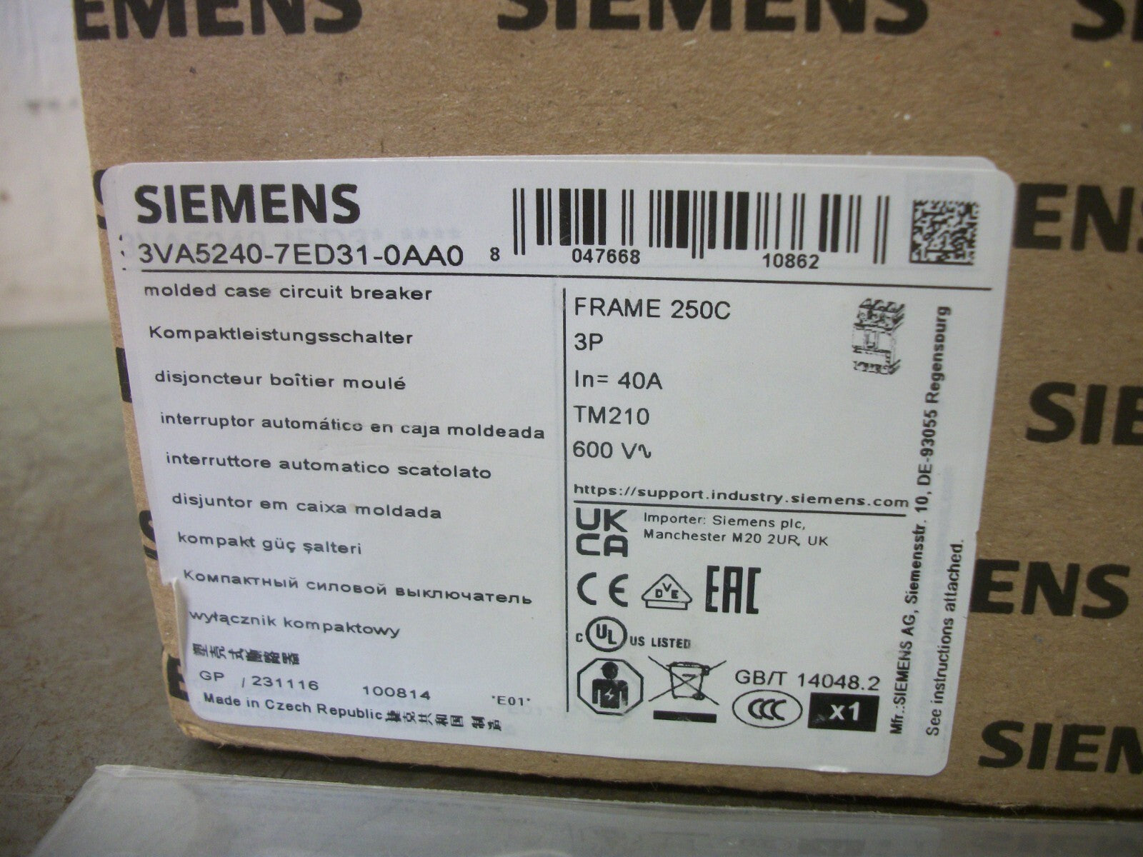 SIEMENS 3VA5 CIRCUIT BREAKER 3VA5240-7ED31-0AA0 40AMP 600VOLT 3POLE NIB