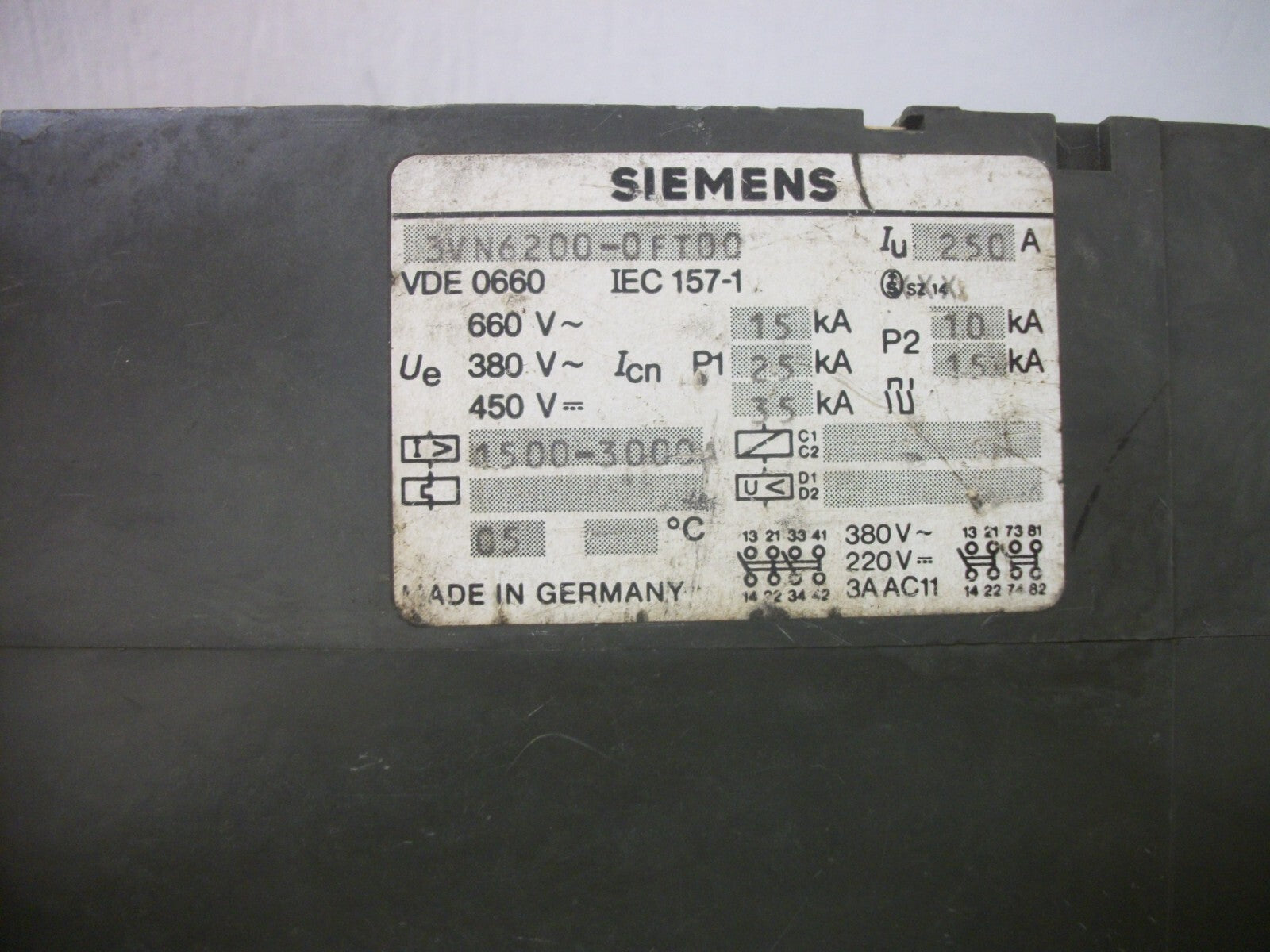 SIEMENS 3VN6 CIRCUIT BREAKER 3VN6200-0FT00 250AMP 660VOLT 3POLE