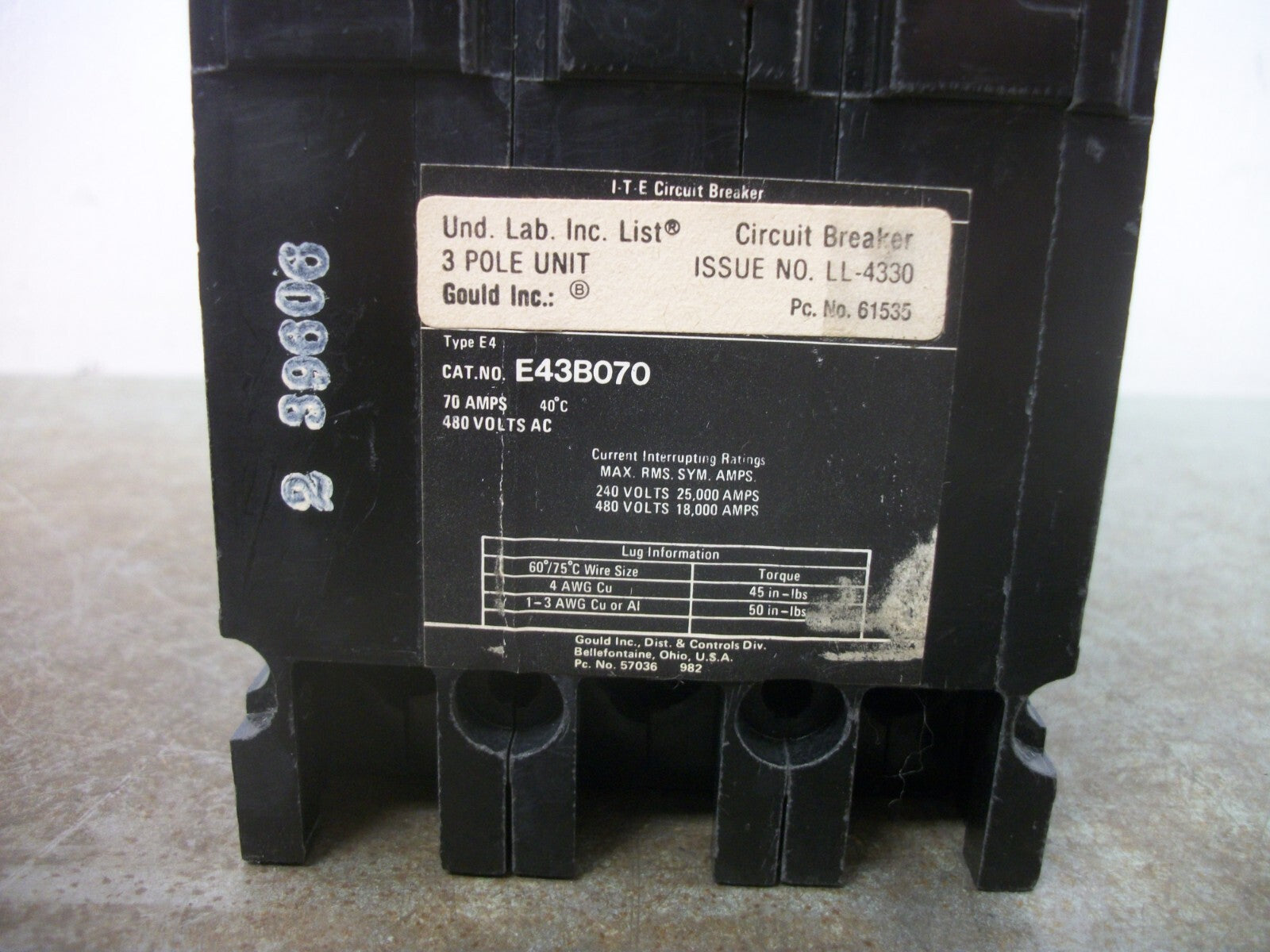 SIEMENS ITE E4 CIRCUIT BREAKER E43B070 70AMP 480VOLT 3POLE