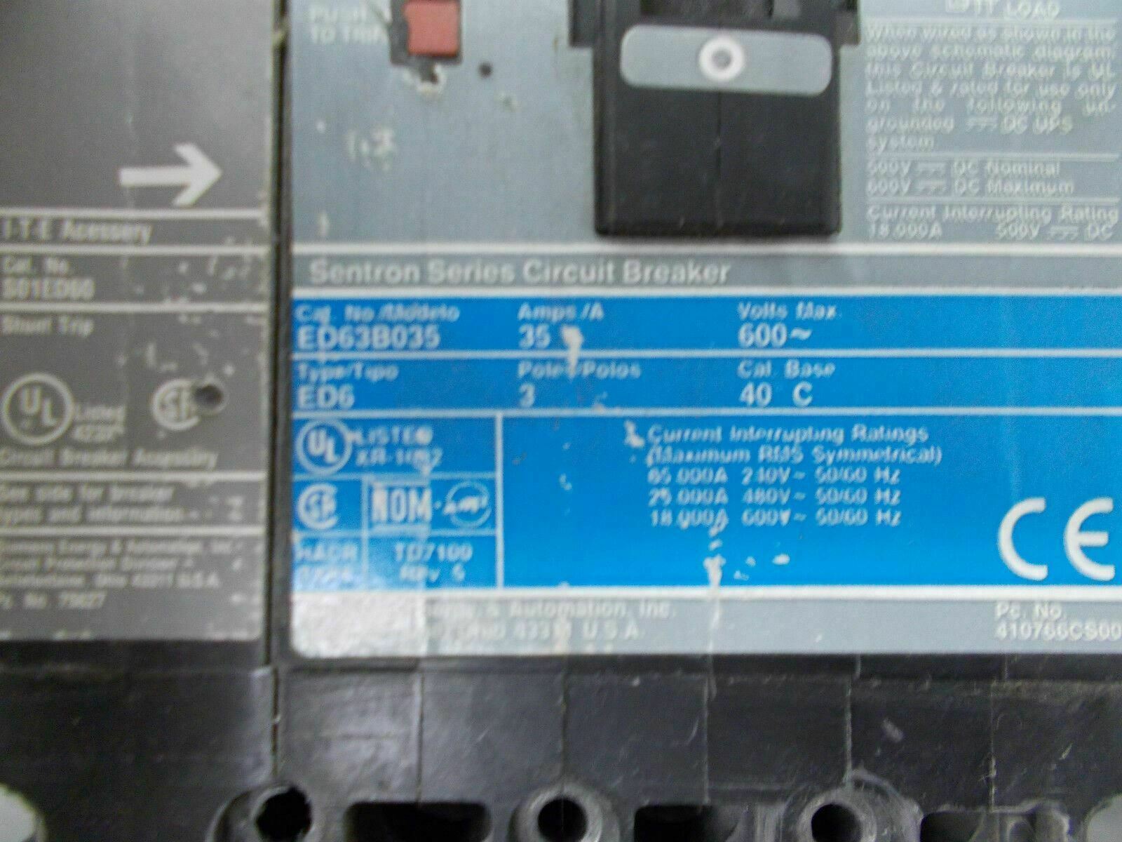 SIEMENS SENTRON ED6 CIRCUIT BREAKER ED63B035 35AMP 600VOLT 3POLE W/SHUNT