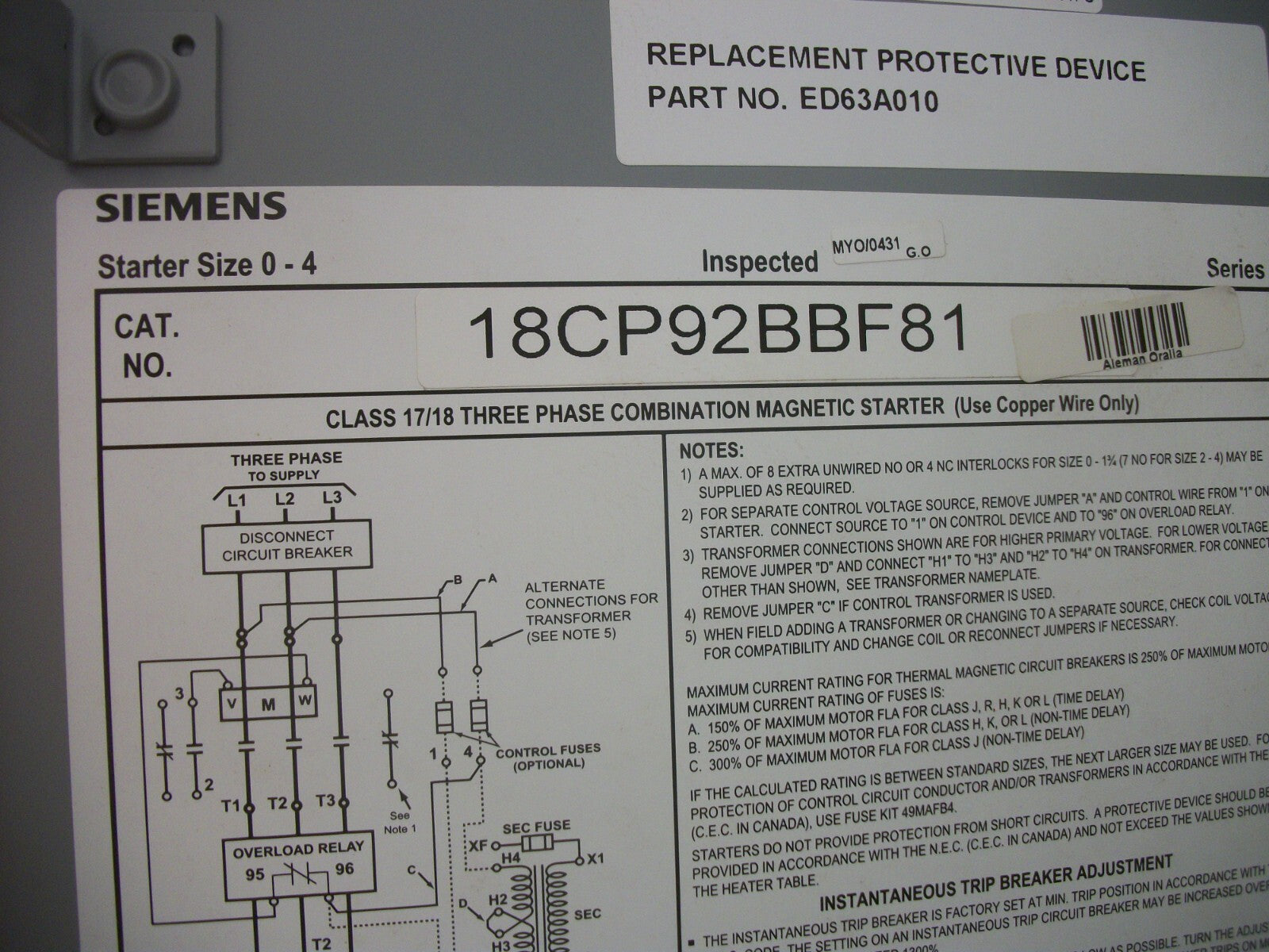 SIEMENS STARTER COMBO SIZE 0 TYPE 1 14CP32A*81 120VCOIL 10AMP BREAKER