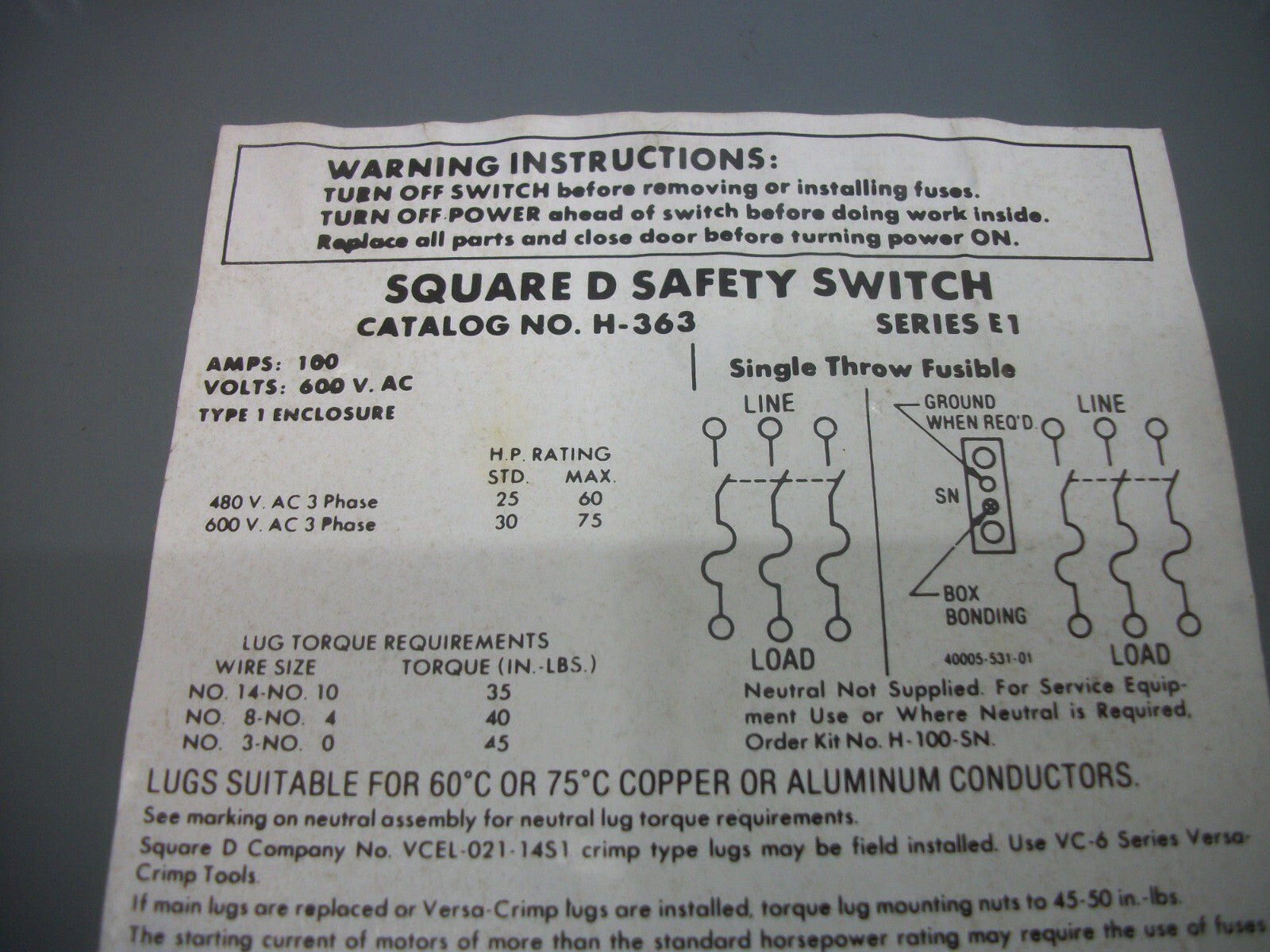 SQUARE D DISCONNECT TYPE 1 H363 100AMP 600VOLT 3POLE FUSIBLE OLD