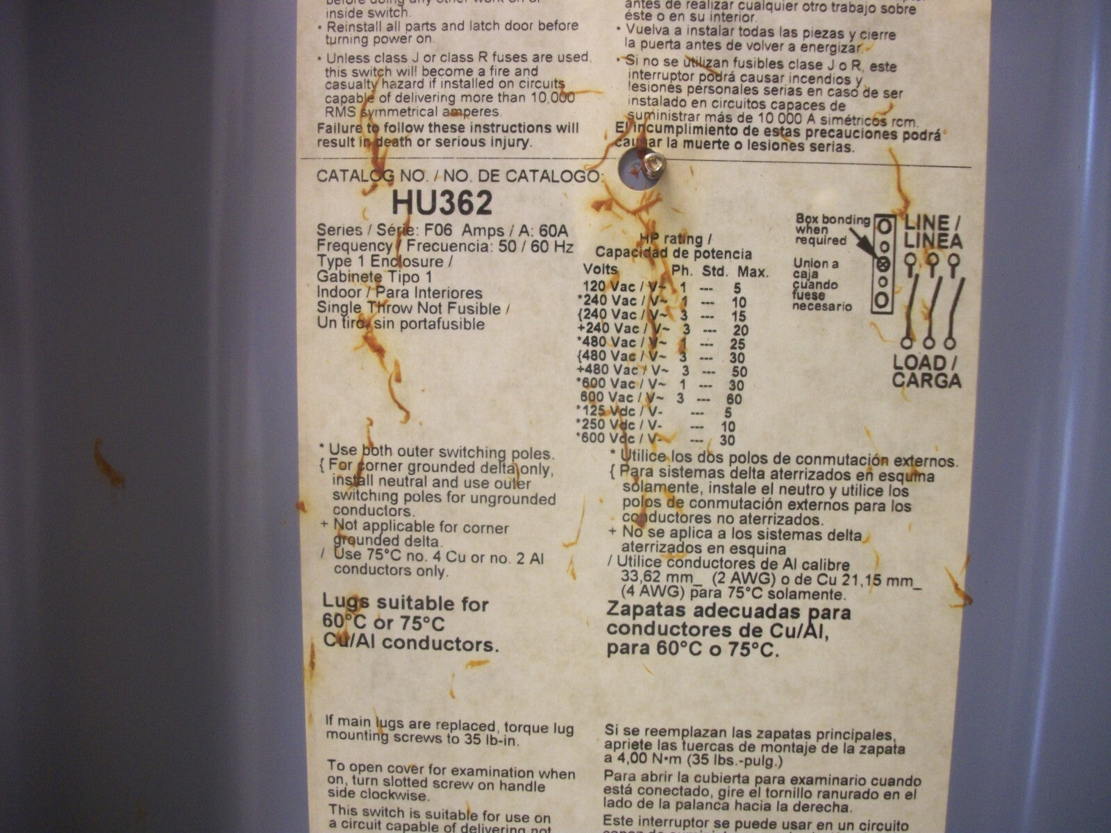 SQUARE D DISCONNECT TYPE 1 HU362 60AMP 600VOLT 3POLE NON-FUSIBLE