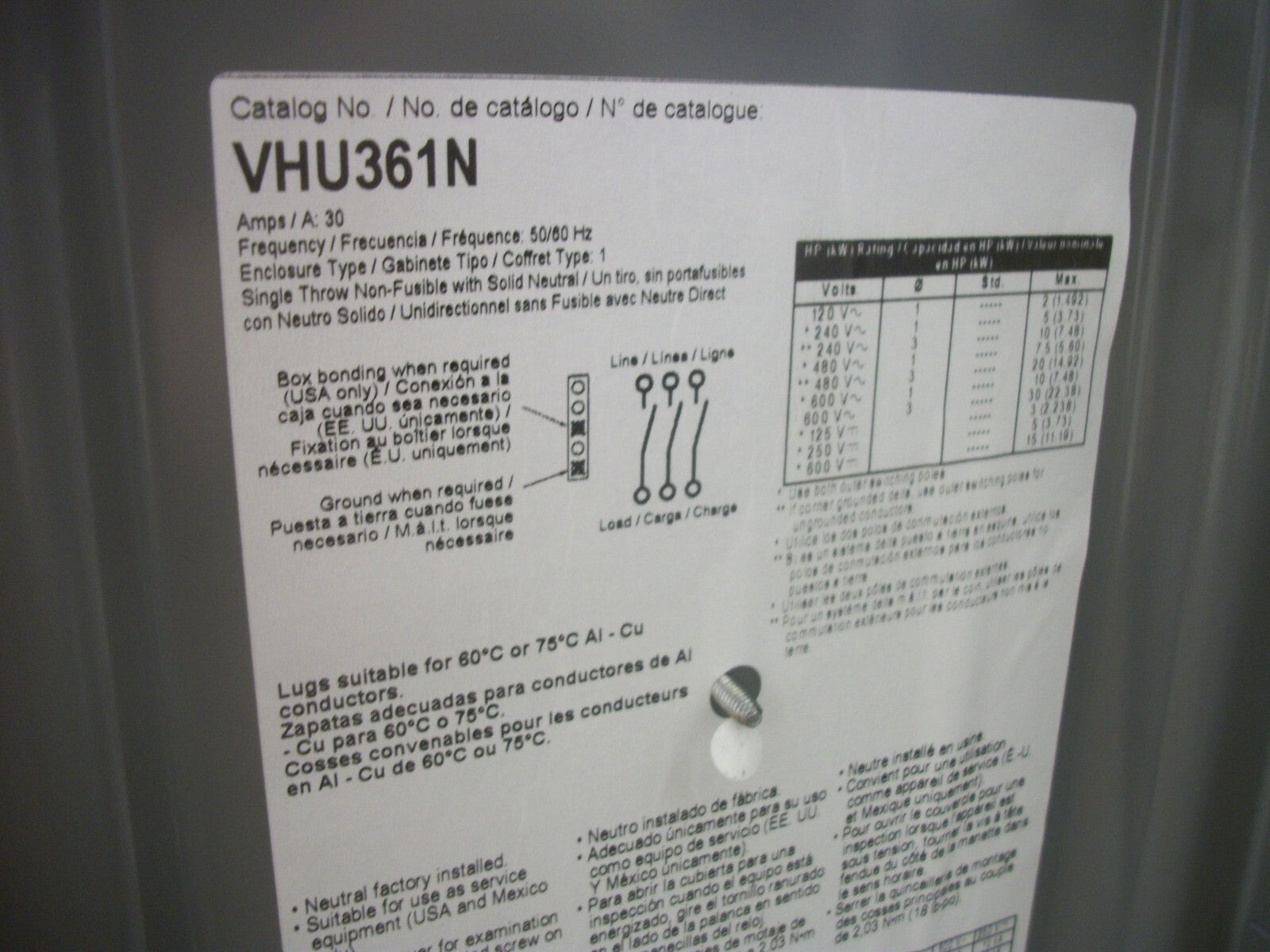 SQUARE D DISCONNECT TYPE 1 VHU361N 30AMP 600VOLT 3POLE FUSIBLE NOB
