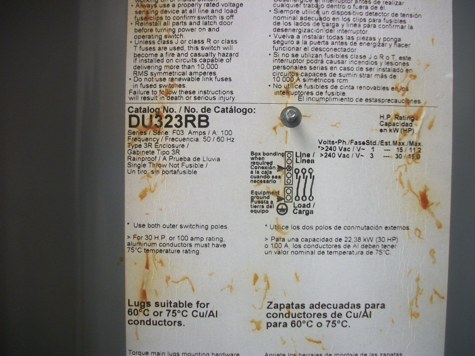 SQUARE D DISCONNECT TYPE 3R DU323RB 100AMP 240VOLT 3POLE NON-FUSIBLE