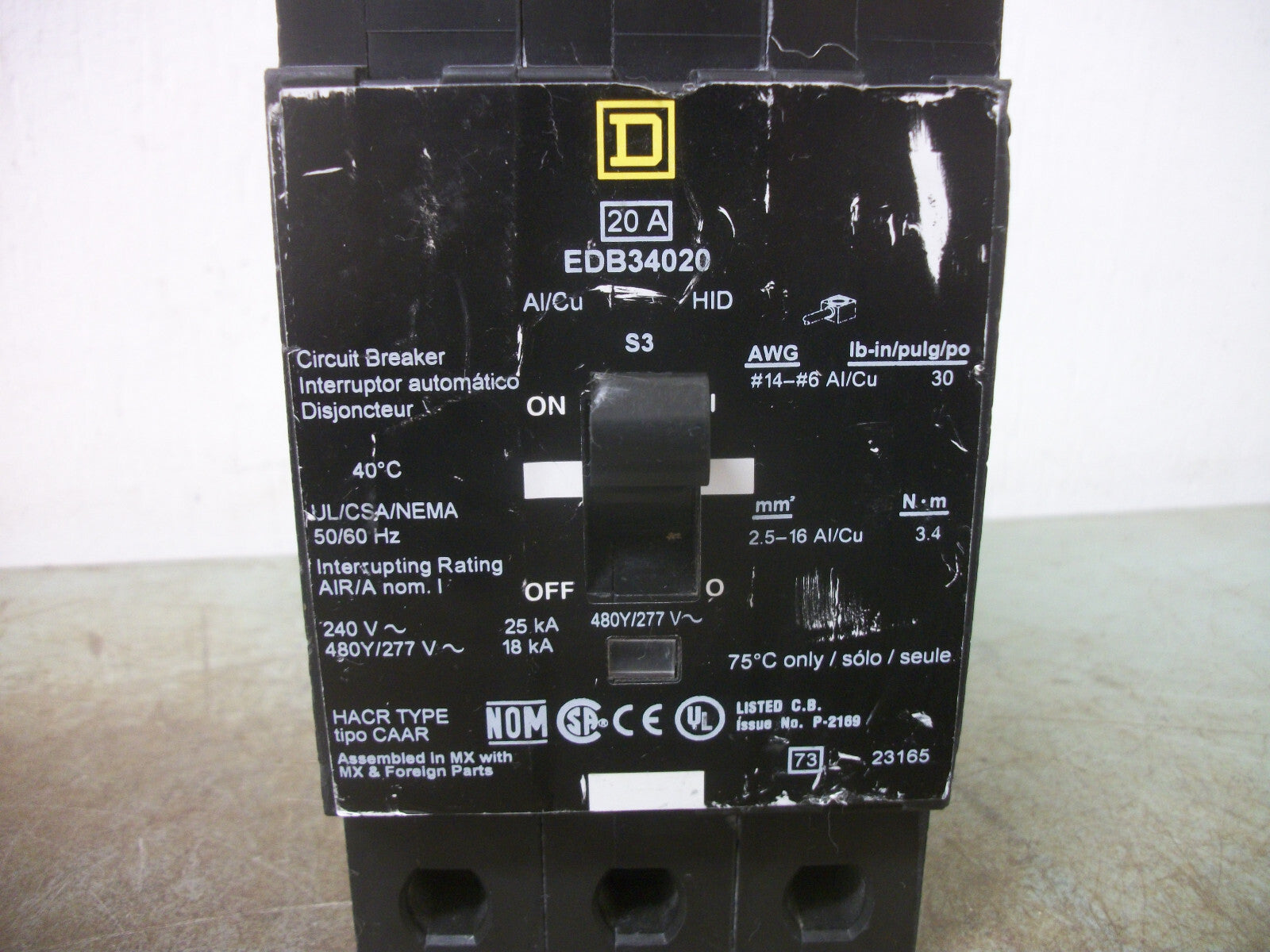 SQUARE D EDB CIRCUIT BREAKER EDB34020 20AMP 480VOLT 3POLE