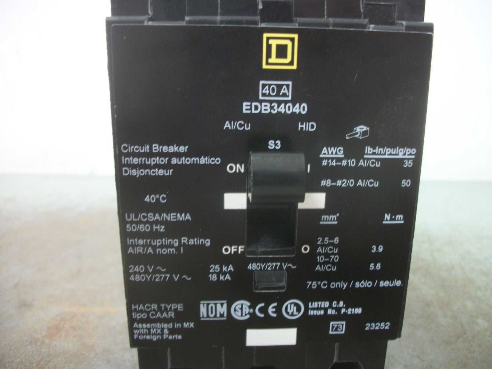 SQUARE D EDB CIRCUIT BREAKER EDB34040 40AMP 480VOLT 3POLE NOB