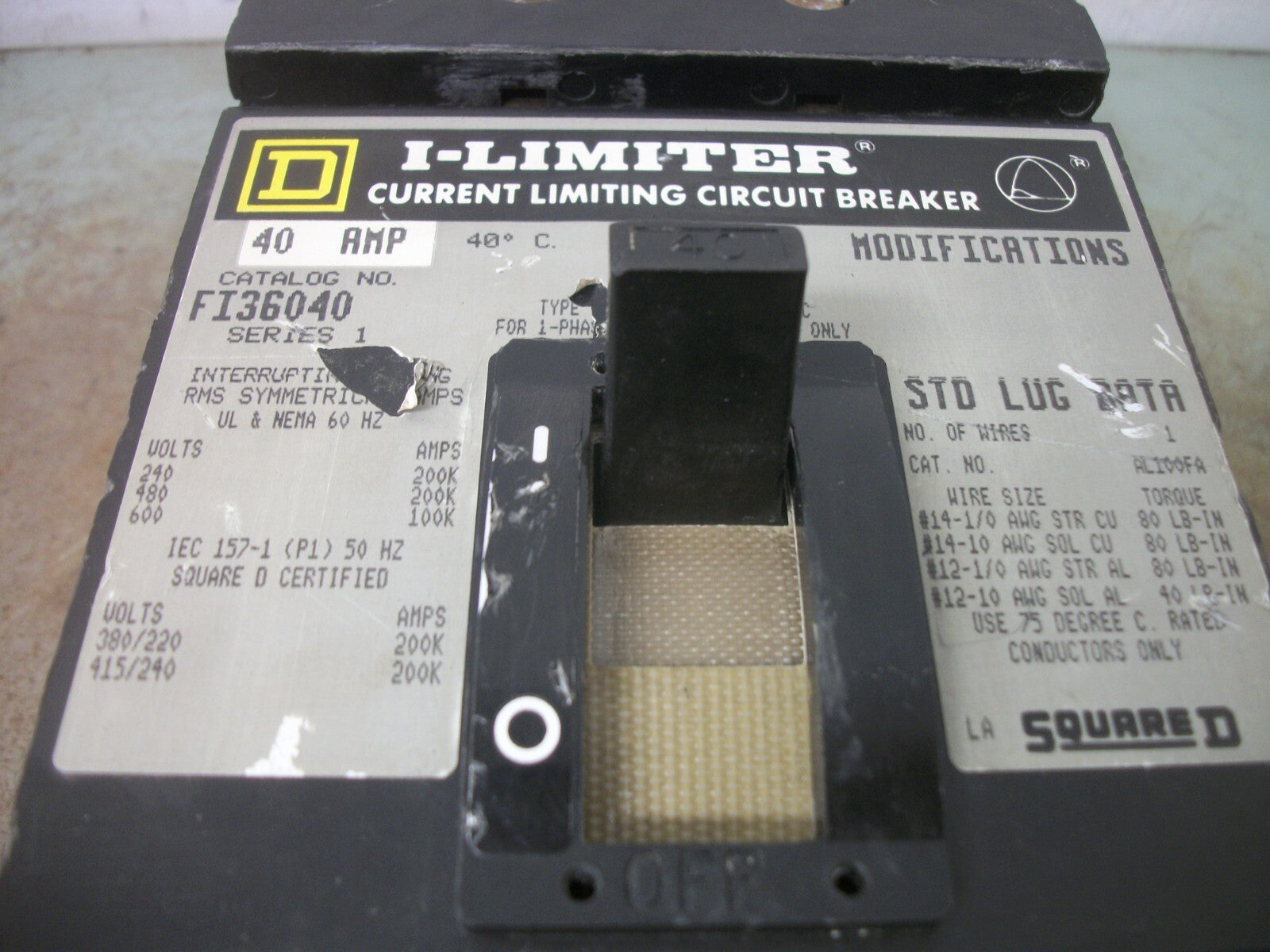 SQUARE D I-LIMITER I-LINE FI CIRCUIT BREAKER FI36040 40AMP 600VOLT 3POLE CRACKED