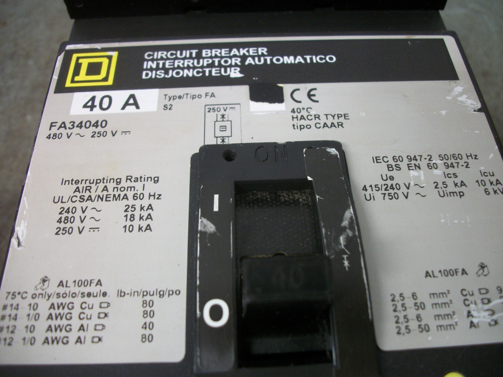 SQUARE D I-LINE FA CIRCUIT BREAKER FA34040 40AMP 480VOLT 3POLE GRAY