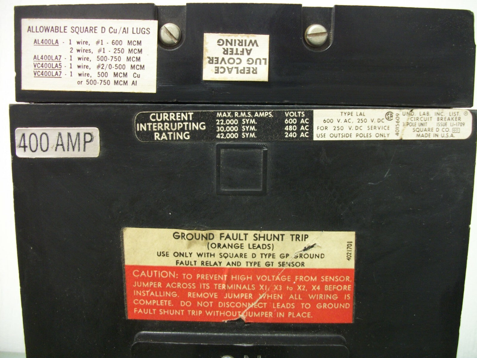SQUARE D LAL CIRCUIT BREAKER LAL36400G 400AMP 600VOLT 3POLE GROUND FAULT SHUNT