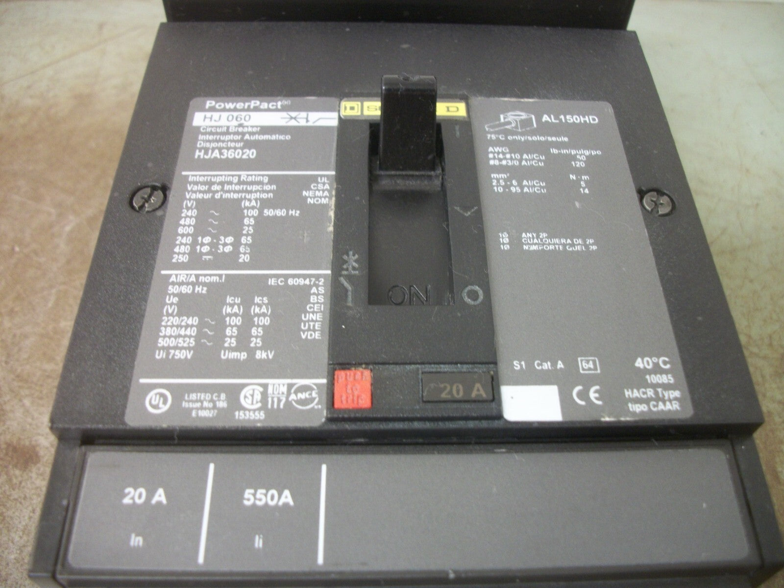 SQUARE D POWERPACT I-LINE HJ CIRCUIT BREAKER HJA36020 20AMP 600VOLT 3POLE