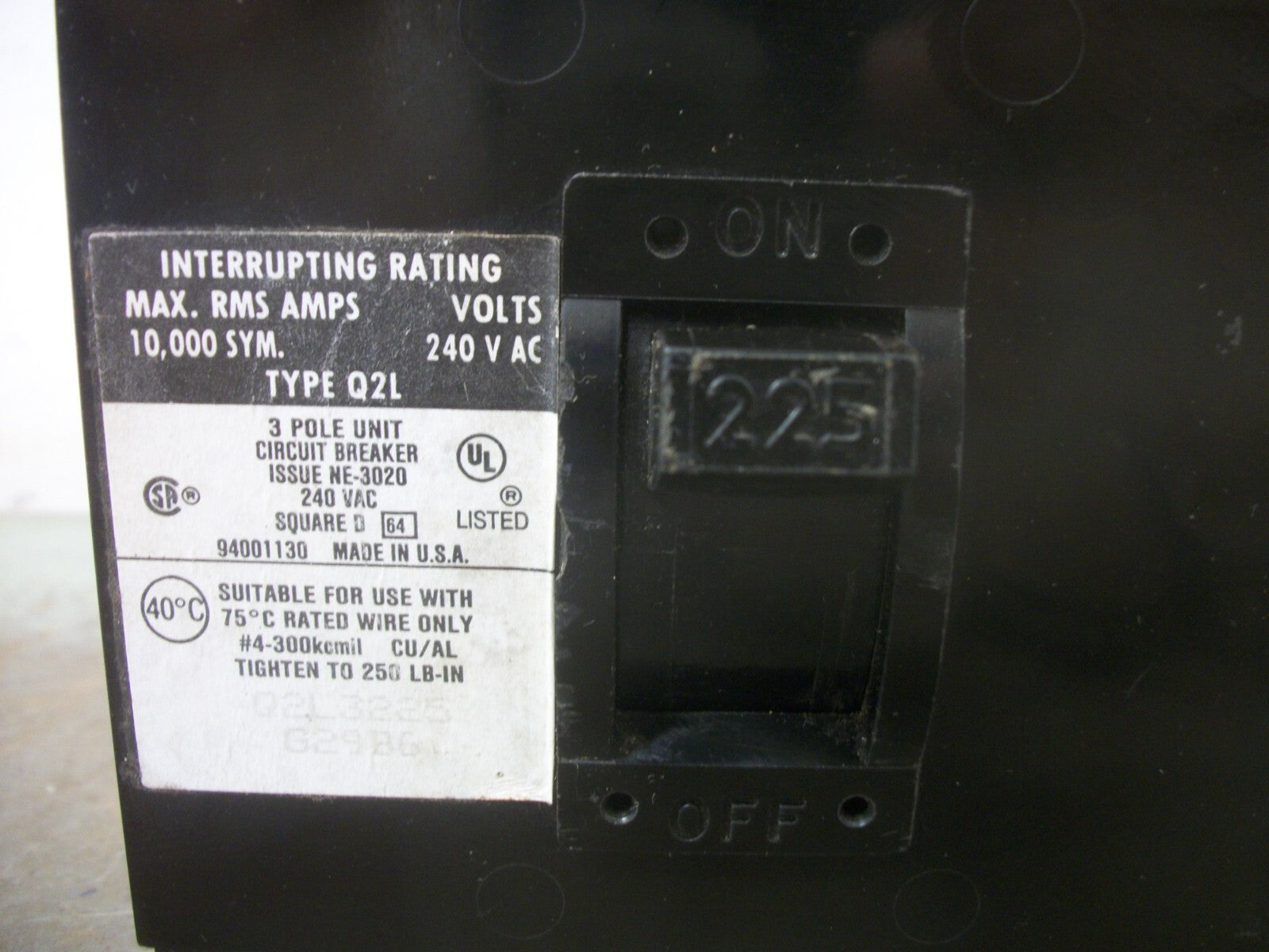 SQUARE D Q2L CIRCUIT BREAKER Q2L3225 225AMP 240VOLT 3POLE