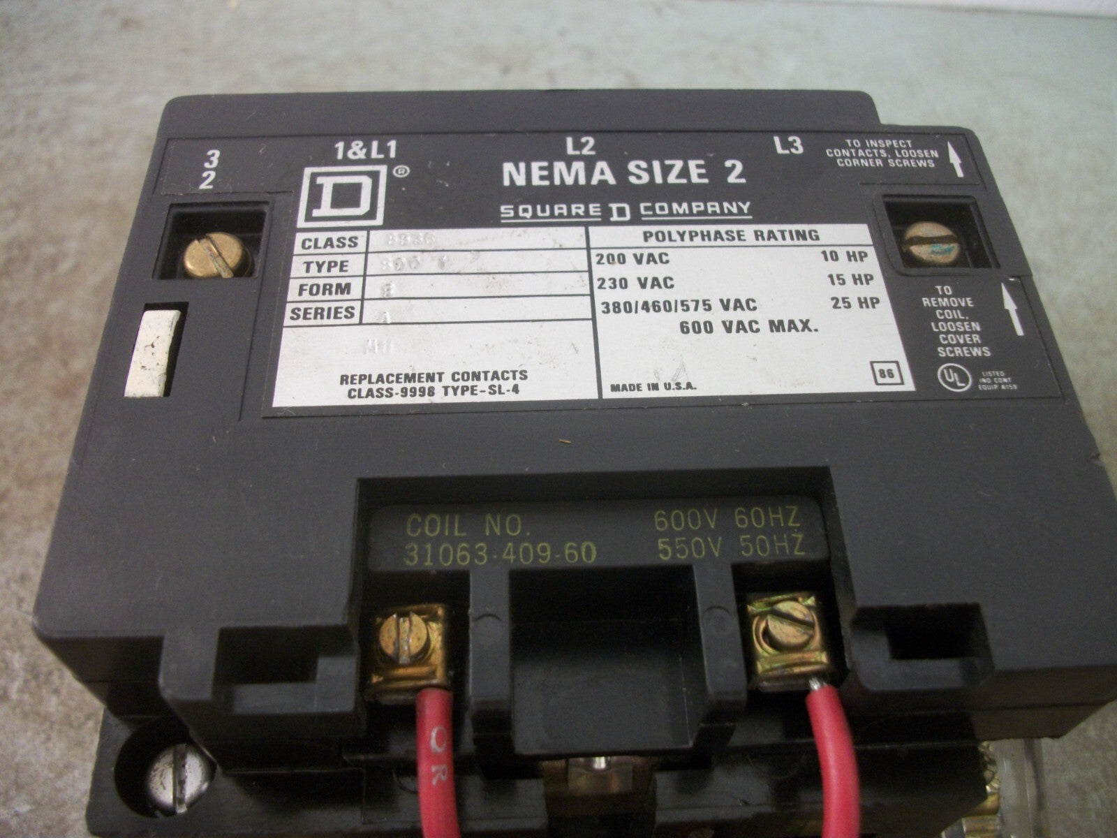 SQUARE D SIZE 2 MOTOR STARTER 8536SDO1 600VCOIL 3PH 600V 25HP