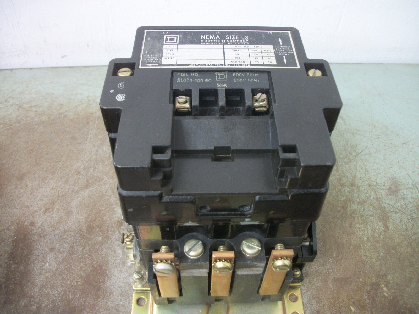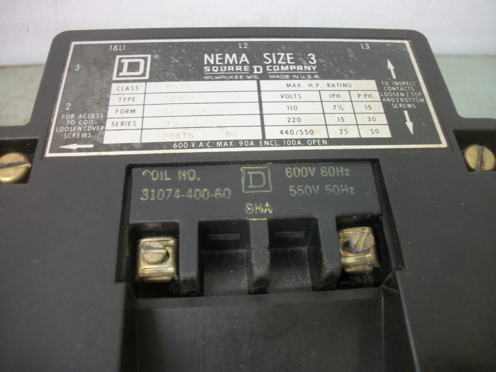 SQUARE D SIZE 3 CONTACTOR 8536SEO1 600VCOIL 3PH 600V 50HP