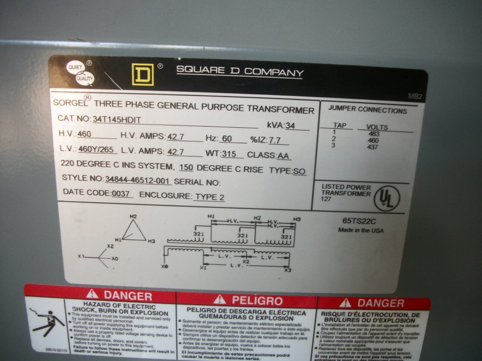 SQUARE D SORGEL 34KVA 3PH TRANSFORMER 34T145HDIT HV 460 LV 460Y265 NEW